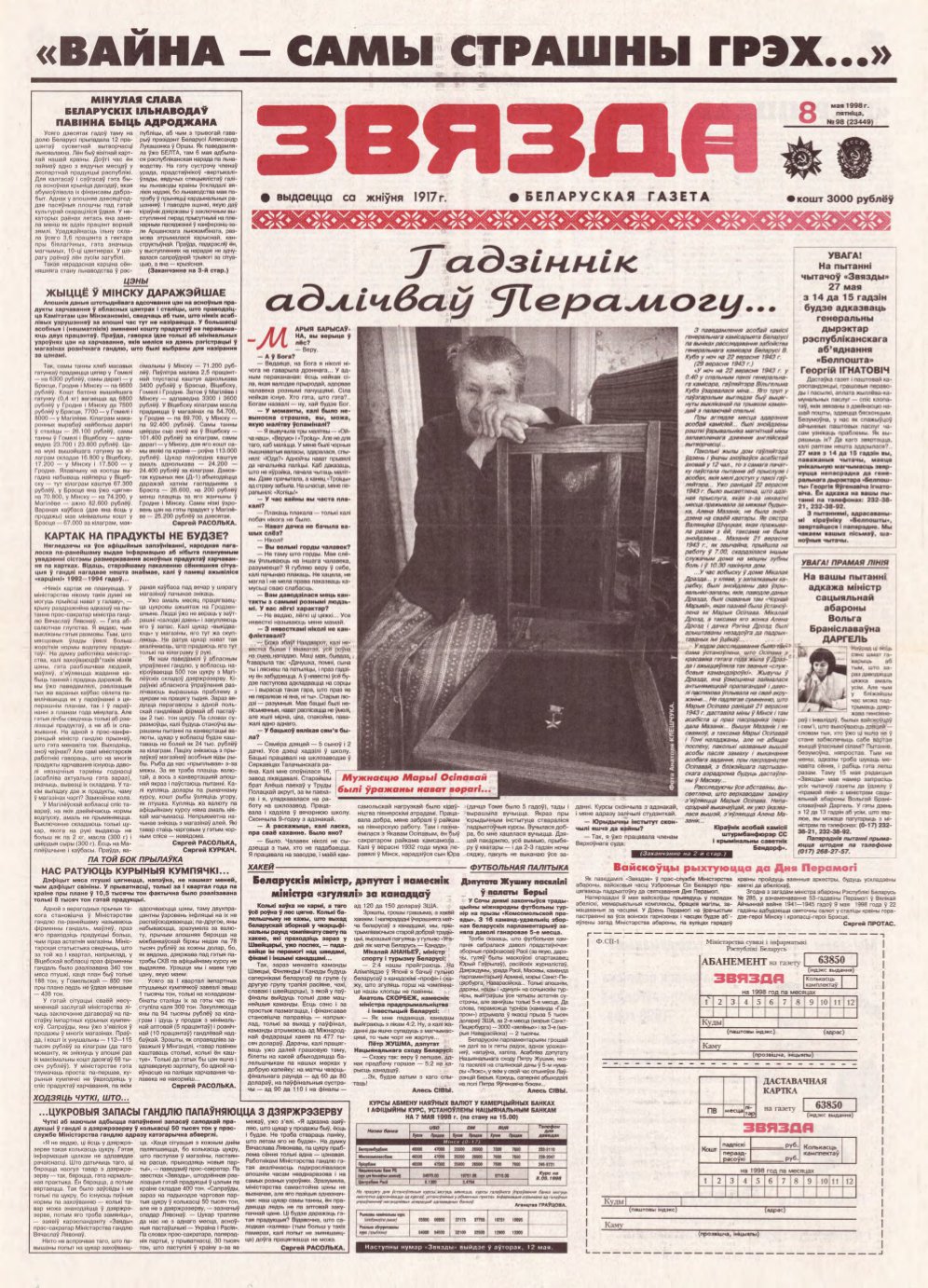 «Звязда» — орган Цэнтральнага Камітэта Камуністычнай партыі Беларусі, Вярхоўнага Савета і Савета Міністраў Беларускай ССР. Выходзіць 250 разоў на год. Аўтары апублікаваных матэрыялаў нясуць адказнасць за падбор і дакладнасць фактаў. Іх меркаванні неабавязкова адлюстроўваюць пункт гледжання рэдакцыі. Болей »