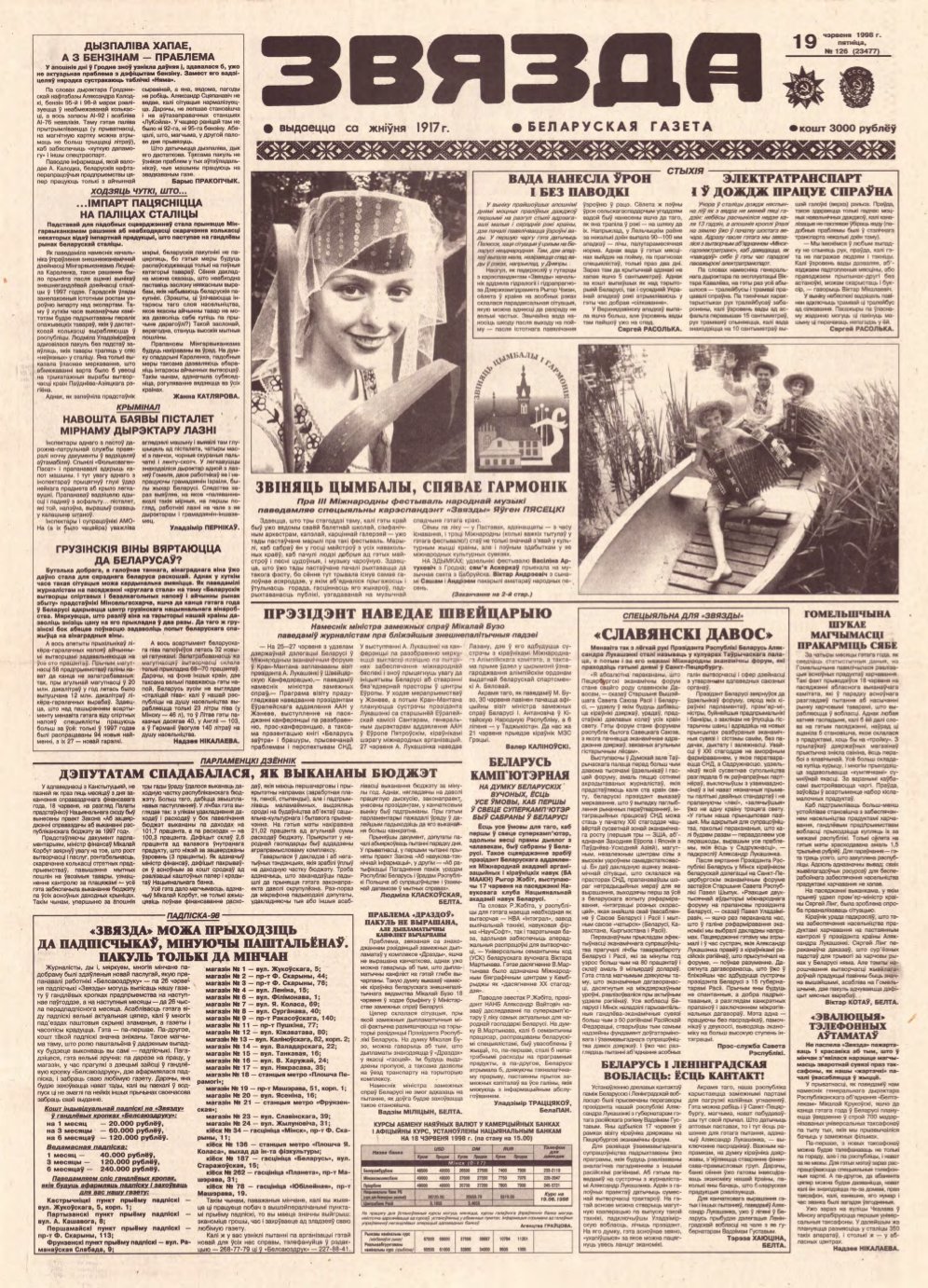 «Звязда» — орган Цэнтральнага Камітэта Камуністычнай партыі Беларусі, Вярхоўнага Савета і Савета Міністраў Беларускай ССР. Выходзіць 250 разоў на год. Аўтары апублікаваных матэрыялаў нясуць адказнасць за падбор і дакладнасць фактаў. Іх меркаванні неабавязкова адлюстроўваюць пункт гледжання рэдакцыі. Болей »