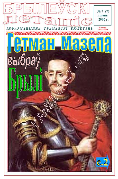 Брылеўскі шлях гетмана Мазепы Плынь гісторыі нетаропка і няспынна вандруе з дня сёняшняга ў дзень мінулы. І часам над гэтай таемнай ракой уздымаюцца хвалі ўспамінаў аб мінулым - і мы пачынаем слухаць галасы сведкаў. А калі ў гэтай гаворцы мільгаюць знаёмыя назвы, то пачынаеш разумець, наколькі цікавымі могуць быць гістарычныя перакрыжаванні… Адкрыўшы нумар “Магілёўскай праўды” ад 14 ліпеня 2006 года і ўчытаўшыся ў артыкул вядомага краязнаўцы Барыса Сідарэнкі, я, шчыра кажучы, быў прыемна здзіўлены. Думаю, што і чытачы “Брылеўскага летапісу” падзеляць мае пачуцці, убачыўшы вось гэтыя радкі: “...Того же года (1706), - сообщает игумен Орест, - для встречи гетмана Ивана Мазепы, шедшего с Малороссийским войском, посланы были из Могилёва магистратские чиновники с вином, мёдом, хлебом и другими съестными припасами. Гетман Мазепа принял благо- склонно поднесённые ему дары, благодарил, в город же Могилёв не поехал, но стоял три дня недалеко от Могилёва в деревне Брилях; а потом отправился к Московскому государю”. Хто ж такі гетман Мазепа і чаму ў сёняшняй Украіне выяву з яго тварам змяшчаюць на грашовых банкнотах?