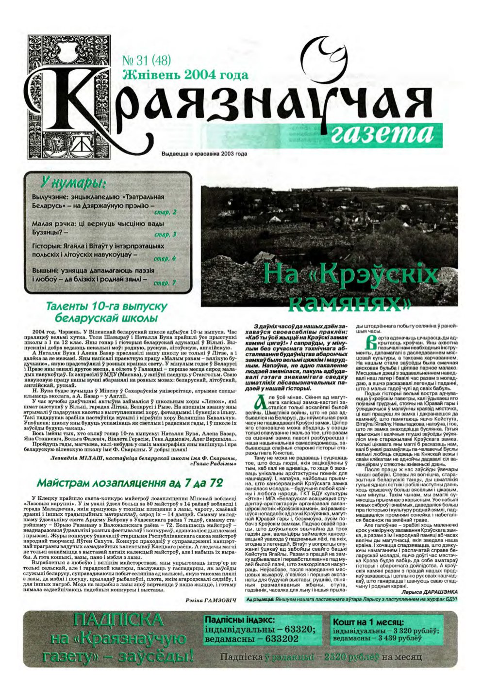 «Краязнаўчая газета» выдаецца з красавіка 2003 г. Штомесяц выходзіць чатыры нумары. На старонках выдання змяшчаюцца артыкулы мясцовых краязнаўцаў, прысвечаныя гісторыі і традыцыям рэгіёнаў нашай краіны, даследаванні навукоўцаў пра гісторыю, этнаграфію, фальклор і архітэктуру, пра гістарычныя падзеі і асобаў, а таксама расповяды пра нашых землякоў, якія праславіліся не толькі ў ў Беларусі, але і за яе межамі. Асобная ўвага надаецца публі... More »