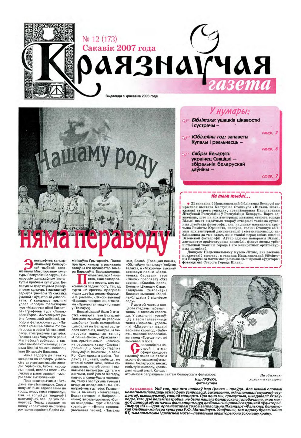 «Краязнаўчая газета» выдаецца з красавіка 2003 г. Штомесяц выходзіць чатыры нумары. На старонках выдання змяшчаюцца артыкулы мясцовых краязнаўцаў, прысвечаныя гісторыі і традыцыям рэгіёнаў нашай краіны, даследаванні навукоўцаў пра гісторыю, этнаграфію, фальклор і архітэктуру, пра гістарычныя падзеі і асобаў, а таксама расповяды пра нашых землякоў, якія праславіліся не толькі ў ў Беларусі, але і за яе межамі. Асобная ўвага надаецца публі... Болей »