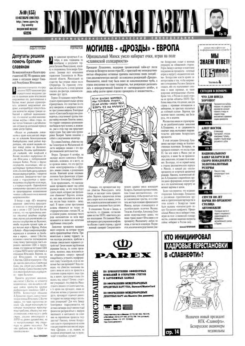 «БелГазета» —інфармацыйна-аналітычная рускамоўная газета, выходзіць штотыдзень у Беларусі. Да верасня 2005 года — «Беларуская газета». Займаецца незалежным асвятленнем падзей эканамічнага, унутрыпалітычнага, дзелавога, культурнага, грамадскага, міжнароднага жыцця Беларусі і блізкага замежжа (Расія, Украіна, краіны Балтыі). Асноўная тэматыка: дзяржава, палітыка, эканоміка, бізнэс, кампаніі і рынкі, грамадства, здарэнні, крымінал, шоу-біз... Болей »