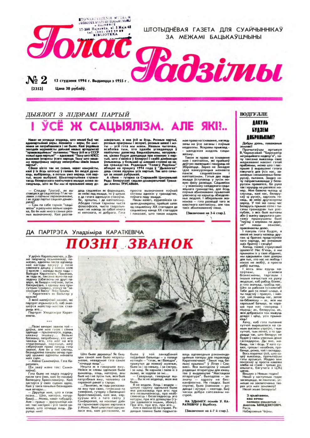«Голас Радзімы» — штотыднёвая газета для суайчыннікаў за межамі Беларусі. Выдаецца з 6 красавіка 1955 года ў Мінску на беларускай мове штотыднёва. Да студзеня 1960 года называлася «За вяртанне на Радзіму». З сярэдзіны 1970-х гадоў асвятляла жыццё, у тым ліку беларускай эміграцыі. З сярэдзіны 1990-х гадоў адзінае беларускае выданне, якое распаўсюджвалася сярод нацыянальнай дыяспары і ў асяроддзі замежных беларусістаў. Болей »