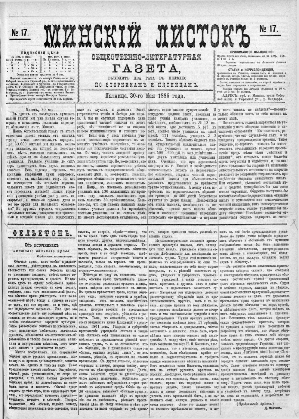 «Минскій листокъ» — общественно-литературная газета. Першая ў Беларусі прыватная асветніцкая газета, якая выдавалася ў Мінску з 1886 па 1902 гады на рускай мове. Выходзіла з рознай перыядычнасцю: з 1886 па 1896 - 2 разы на тыдзень, з 1896-1898 - штодня, з 1898 па 1902 - 3 разы на тыдзень і ў 1902 - 4 разы. Выдавец - мінскі натарыус І. П. Фацінскі. Газета «Минскій листокъ» выдавалася на рускай мове, але друкавала і артыкулы беларускіх лі... Болей »