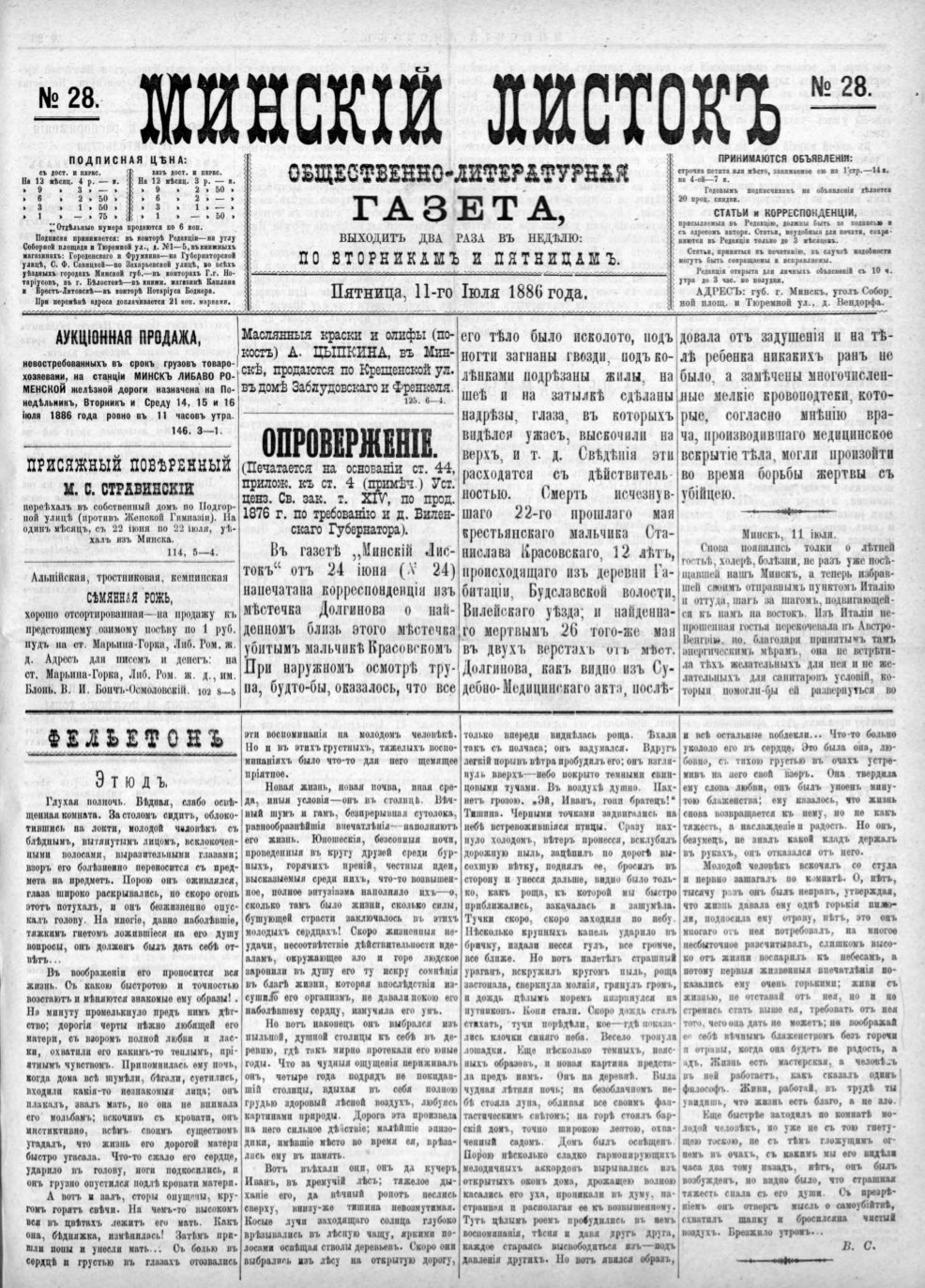 «Минскій листокъ» — общественно-литературная газета. Першая ў Беларусі прыватная асветніцкая газета, якая выдавалася ў Мінску з 1886 па 1902 гады на рускай мове. Выходзіла з рознай перыядычнасцю: з 1886 па 1896 - 2 разы на тыдзень, з 1896-1898 - штодня, з 1898 па 1902 - 3 разы на тыдзень і ў 1902 - 4 разы. Выдавец - мінскі натарыус І. П. Фацінскі. Газета «Минскій листокъ» выдавалася на рускай мове, але друкавала і артыкулы беларускіх лі... Болей »