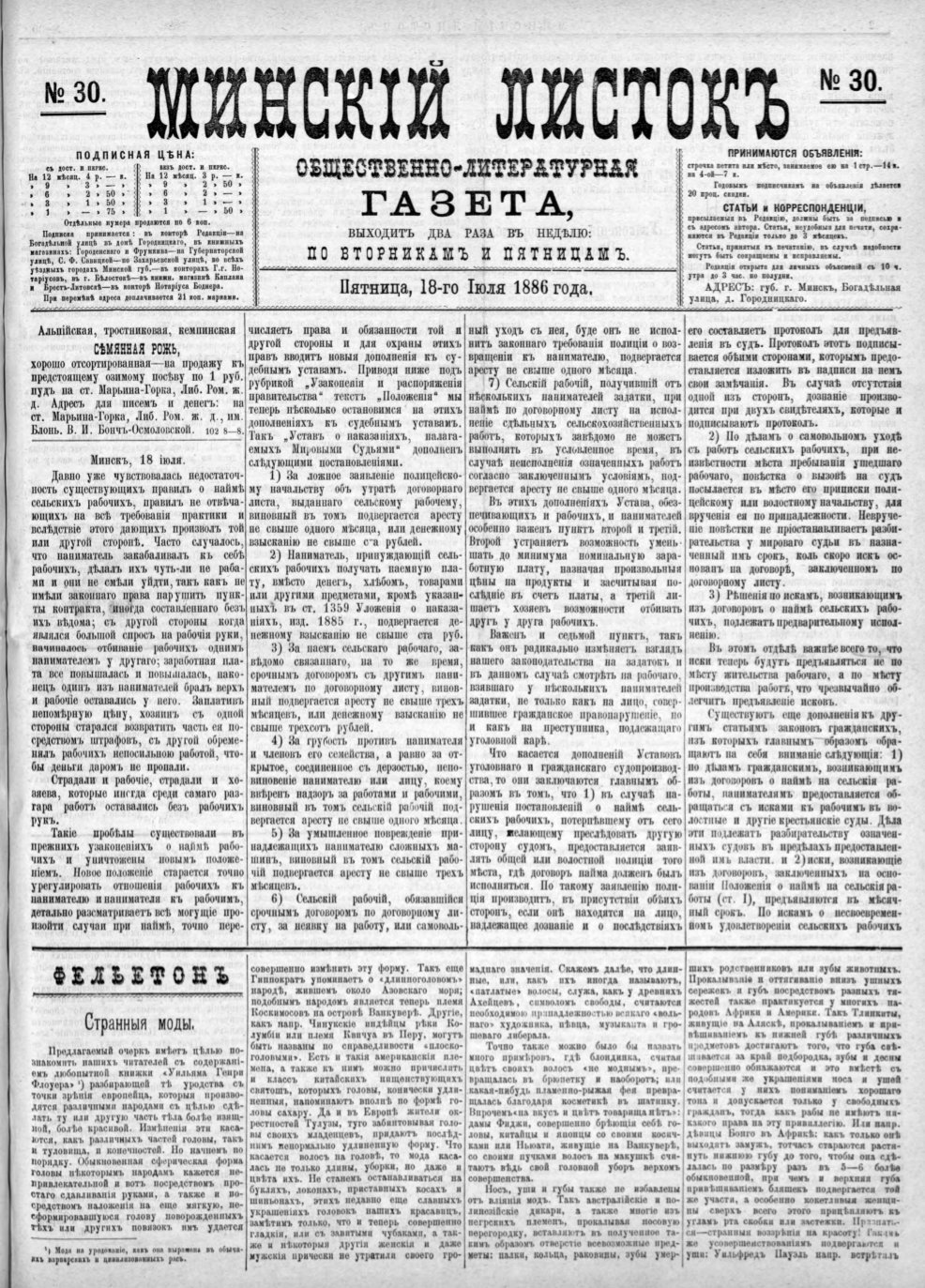 «Минскій листокъ» — общественно-литературная газета. Першая ў Беларусі прыватная асветніцкая газета, якая выдавалася ў Мінску з 1886 па 1902 гады на рускай мове. Выходзіла з рознай перыядычнасцю: з 1886 па 1896 - 2 разы на тыдзень, з 1896-1898 - штодня, з 1898 па 1902 - 3 разы на тыдзень і ў 1902 - 4 разы. Выдавец - мінскі натарыус І. П. Фацінскі. Газета «Минскій листокъ» выдавалася на рускай мове, але друкавала і артыкулы беларускіх лі... Болей »