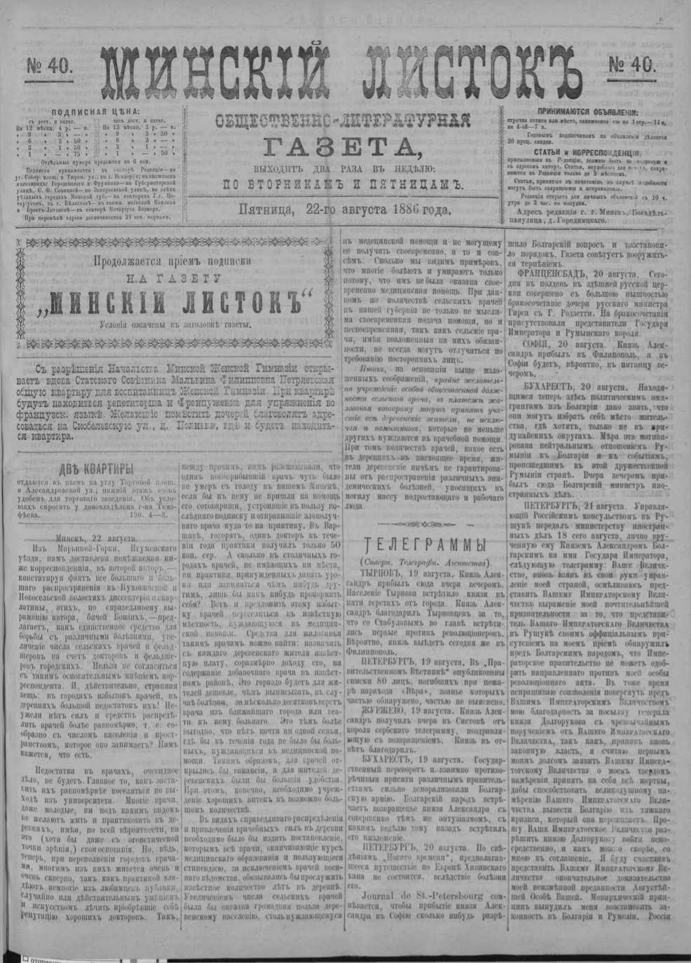 «Минскій листокъ» — общественно-литературная газета. Першая ў Беларусі прыватная асветніцкая газета, якая выдавалася ў Мінску з 1886 па 1902 гады на рускай мове. Выходзіла з рознай перыядычнасцю: з 1886 па 1896 - 2 разы на тыдзень, з 1896-1898 - штодня, з 1898 па 1902 - 3 разы на тыдзень і ў 1902 - 4 разы. Выдавец - мінскі натарыус І. П. Фацінскі. Газета «Минскій листокъ» выдавалася на рускай мове, але друкавала і артыкулы беларускіх лі... More »