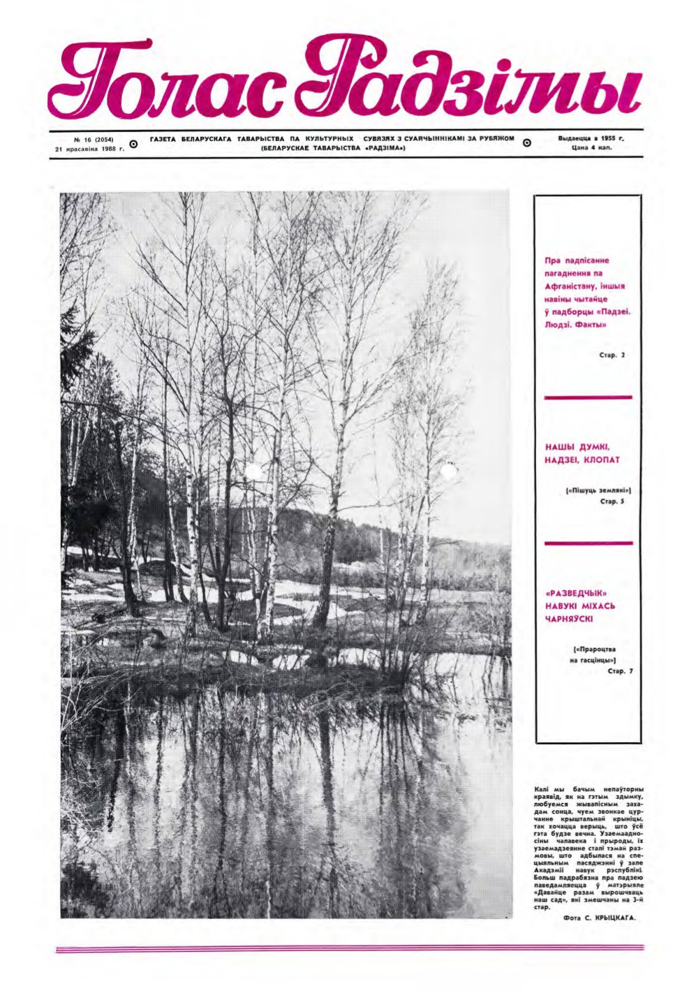 «Голас Радзімы» — штотыднёвая газета для суайчыннікаў за межамі Беларусі. Выдаецца з 6 красавіка 1955 года ў Мінску на беларускай мове штотыднёва. Да студзеня 1960 года называлася «За вяртанне на Радзіму». З сярэдзіны 1970-х гадоў асвятляла жыццё, у тым ліку беларускай эміграцыі. З сярэдзіны 1990-х гадоў адзінае беларускае выданне, якое распаўсюджвалася сярод нацыянальнай дыяспары і ў асяроддзі замежных беларусістаў. Болей »