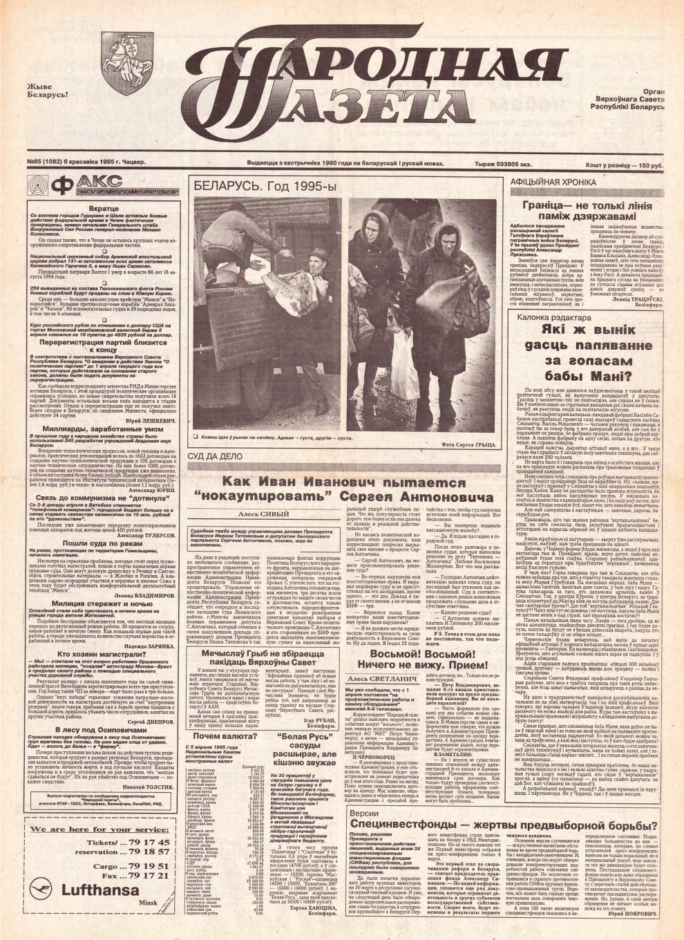 «Народная газета» — орган Вярхоўнага Савета Рэспублікі Беларусь. Выдавец: Адкрытае акцыянернае таварыства Народная газета. Выходзіць штодзённа, акрамя нядзелі і панядзелка, 250 разоў у год. Выдаецца з кастрычніка 1990 года на беларускай і рускай мовах. З 1990 па 1995 год пасаду галоўнага рэдактара «Народнай газеты» займаў Іосіф Сярэдзіч. З мая 1990 па студзень 1996 — дэпутат Вярхоўнага Савета XII склікання. Выданне займала ўмераную цэнт... Болей »