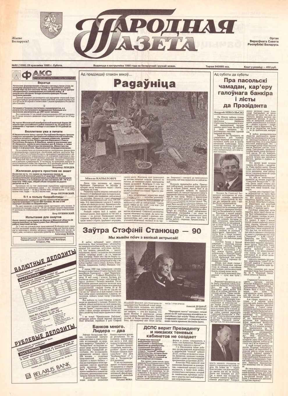 «Народная газета» — орган Вярхоўнага Савета Рэспублікі Беларусь. Выдавец: Адкрытае акцыянернае таварыства Народная газета. Выходзіць штодзённа, акрамя нядзелі і панядзелка, 250 разоў у год. Выдаецца з кастрычніка 1990 года на беларускай і рускай мовах. З 1990 па 1995 год пасаду галоўнага рэдактара «Народнай газеты» займаў Іосіф Сярэдзіч. З мая 1990 па студзень 1996 — дэпутат Вярхоўнага Савета XII склікання. Выданне займала ўмераную цэнт... Болей »