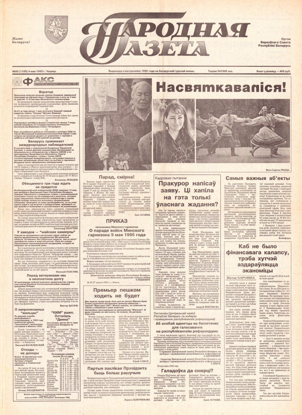 «Народная газета» — орган Вярхоўнага Савета Рэспублікі Беларусь. Выдавец: Адкрытае акцыянернае таварыства Народная газета. Выходзіць штодзённа, акрамя нядзелі і панядзелка, 250 разоў у год. Выдаецца з кастрычніка 1990 года на беларускай і рускай мовах. З 1990 па 1995 год пасаду галоўнага рэдактара «Народнай газеты» займаў Іосіф Сярэдзіч. З мая 1990 па студзень 1996 — дэпутат Вярхоўнага Савета XII склікання. Выданне займала ўмераную цэнт... Болей »