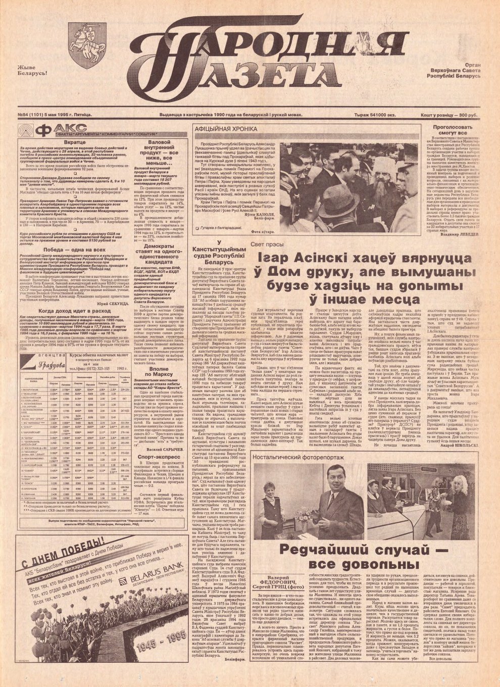 «Народная газета» — орган Вярхоўнага Савета Рэспублікі Беларусь. Выдавец: Адкрытае акцыянернае таварыства Народная газета. Выходзіць штодзённа, акрамя нядзелі і панядзелка, 250 разоў у год. Выдаецца з кастрычніка 1990 года на беларускай і рускай мовах. З 1990 па 1995 год пасаду галоўнага рэдактара «Народнай газеты» займаў Іосіф Сярэдзіч. З мая 1990 па студзень 1996 — дэпутат Вярхоўнага Савета XII склікання. Выданне займала ўмераную цэнт... Болей »