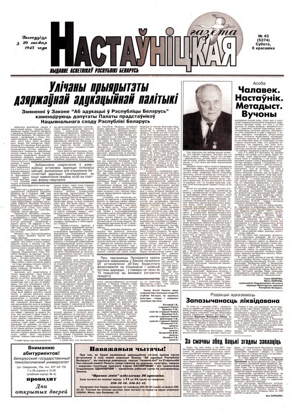 «Настаўніцкая газета» — выданне асветнікаў Рэспублікі Беларусь. Заснавана Міністэрствам адукацыі Рэспублікі Беларусь, выдаецца рэдакцыйна-выдавецкай установай «Выдавецкі дом „Педагагічная прэса“». Выходзіць з 20 снежня 1945 года ў Мінску на беларускай мове (да 1957 года — 1 раз, з 1958 года — 2 разы, з 1998 года — 3 разы на тыдзень). У ліпені 2022 года газета стала выходзіць 2 разы на тыдзень, што значна зменшыла агульны аб’ём выдання. ... Болей »