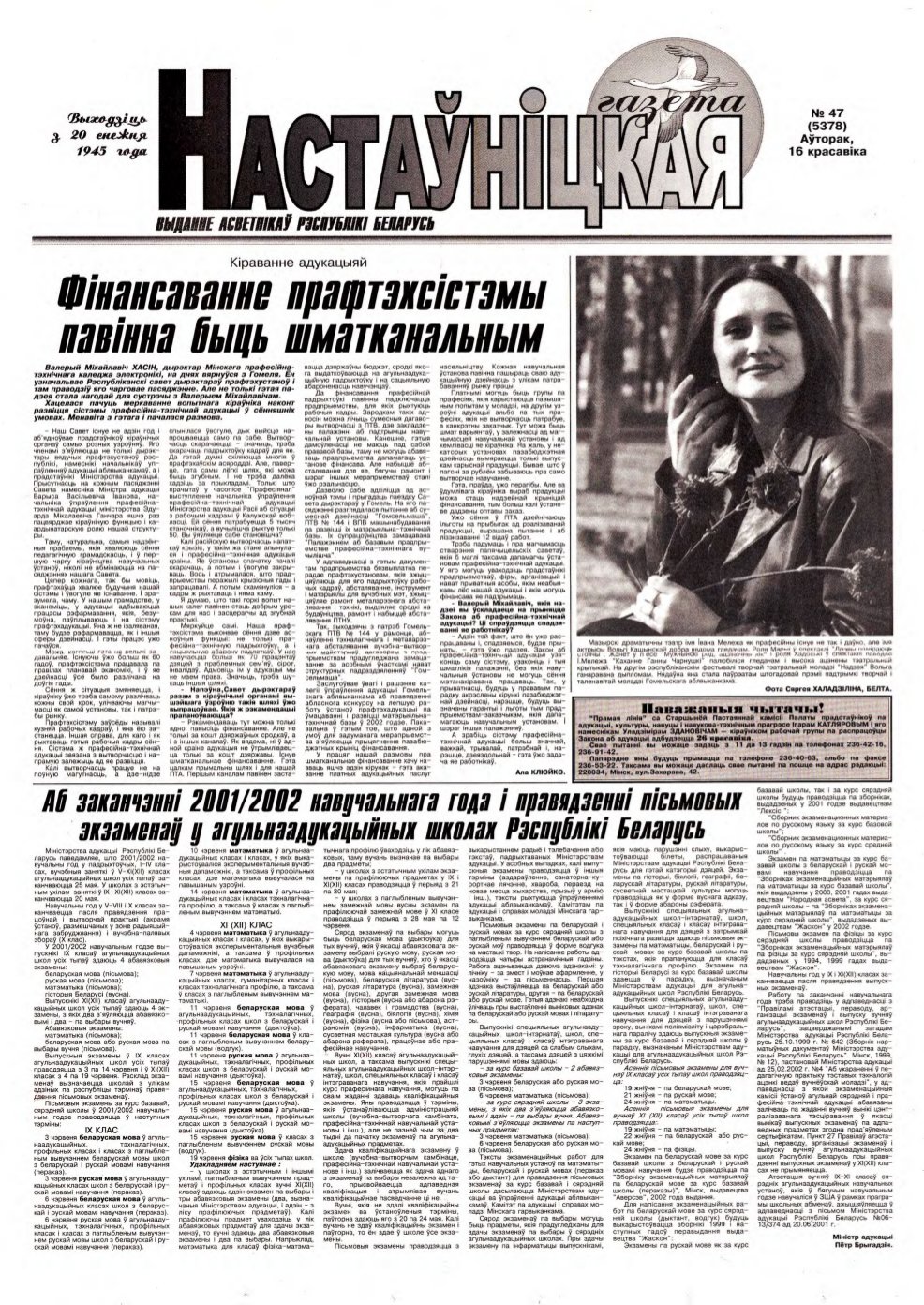 «Настаўніцкая газета» — выданне асветнікаў Рэспублікі Беларусь. Заснавана Міністэрствам адукацыі Рэспублікі Беларусь, выдаецца рэдакцыйна-выдавецкай установай «Выдавецкі дом „Педагагічная прэса“». Выходзіць з 20 снежня 1945 года ў Мінску на беларускай мове (да 1957 года — 1 раз, з 1958 года — 2 разы, з 1998 года — 3 разы на тыдзень). У ліпені 2022 года газета стала выходзіць 2 разы на тыдзень, што значна зменшыла агульны аб’ём выдання. ... Болей »