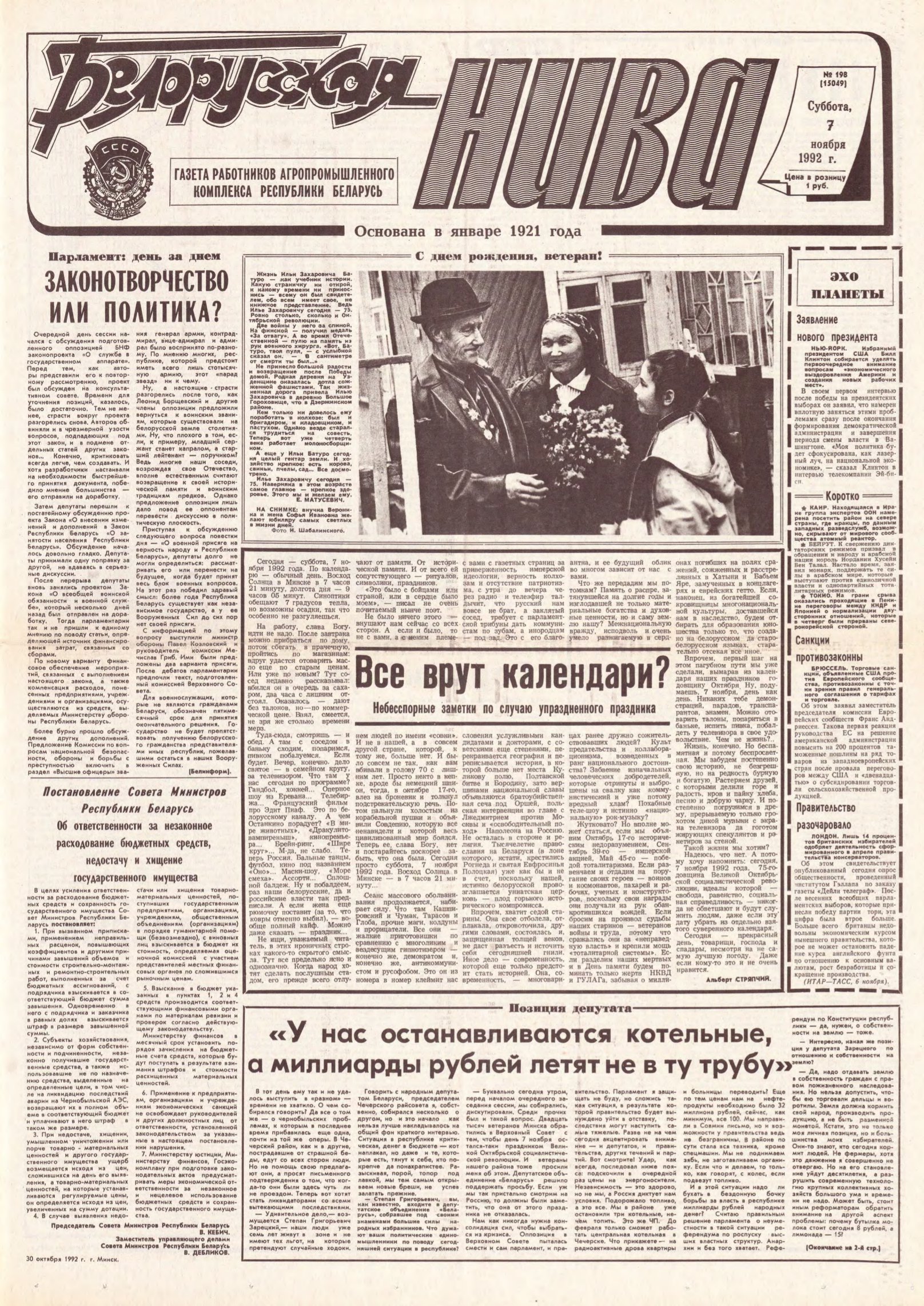 «Белорусская нива» — газета работников Агропромышленного комплекса Республики Беларусь. Учредители: Совет Министров Республики Беларусь и коллектив редакции «Белорусской нивы». За час існавання выданне не раз мяняла назву, мову, арфаграфічныя прынцыпы: спачатку называлася “Белорусская деревня” (на рускай мове), з 1922 г. выходзіла як дадатак да газеты “Звязда”, у 1924 г. яна стала самастойнай і называлася “Беларуская вёска” (на беларуск... Болей »