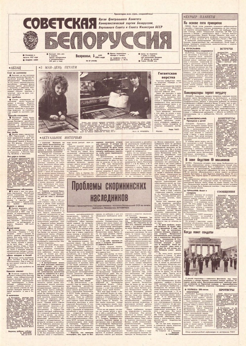 «Советская Белоруссия» — орган Центрального Комитета Коммунистической партии Белоруссии, Верховного Совета и Совета Министров БССР. Белорусская общественно-политическая газета. Издаётся с августа 1927 года. Выходит 5 раз в неделю. Учредители — Администрация президента Республики Беларусь и редакционный совет. На апрель 2019 года тираж — 190 тыс. экземпляров. Крупнейшее печатное СМИ страны. При этом во многих СМИ неоднократно сообщалось ... Болей »