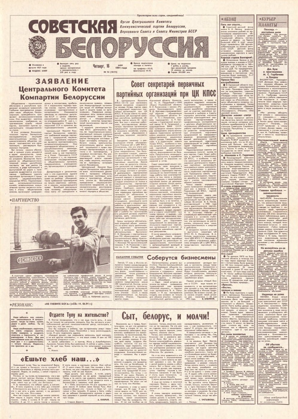«Советская Белоруссия» — орган Центрального Комитета Коммунистической партии Белоруссии, Верховного Совета и Совета Министров БССР. Белорусская общественно-политическая газета. Издаётся с августа 1927 года. Выходит 5 раз в неделю. Учредители — Администрация президента Республики Беларусь и редакционный совет. На апрель 2019 года тираж — 190 тыс. экземпляров. Крупнейшее печатное СМИ страны. При этом во многих СМИ неоднократно сообщалось ... Болей »