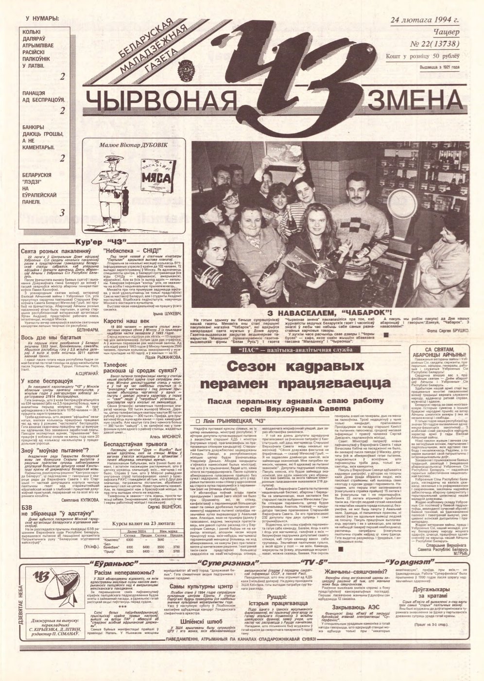 «Чырвоная змена» — беларуская маладзёжная газета. У 1921—2002 гадах з’яўлялася самастойным выданнем. З 2002 года дадатак да газеты «Звязда». З «Чырвонай зменай» ахвотна супрацоўнічаў Уладзімір Караткевіч, тут апублікаваны многія яго вершаваныя творы і эсэ: «Сплятайце рукі», «У тую ноч», «Як стажары ў небе заззялі», «Твой зорны шлях». На старонках газеты была апублікавана і аповесць Васіля Быкава «Жураўліны крык». Болей »