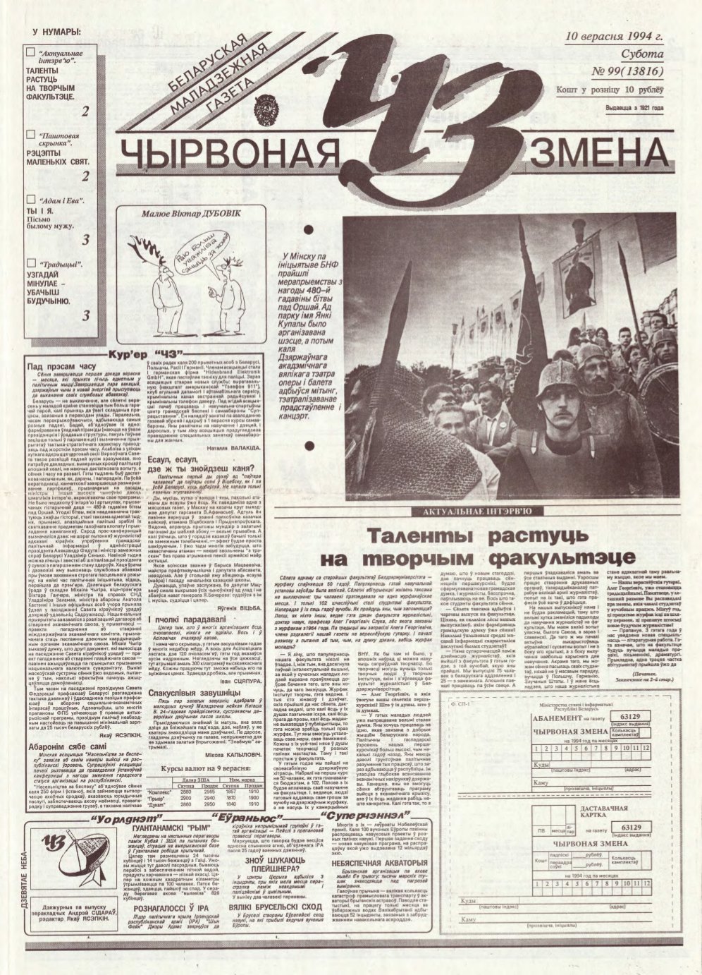 «Чырвоная змена» — беларуская маладзёжная газета. У 1921—2002 гадах з’яўлялася самастойным выданнем. З 2002 года дадатак да газеты «Звязда». З «Чырвонай зменай» ахвотна супрацоўнічаў Уладзімір Караткевіч, тут апублікаваны многія яго вершаваныя творы і эсэ: «Сплятайце рукі», «У тую ноч», «Як стажары ў небе заззялі», «Твой зорны шлях». На старонках газеты была апублікавана і аповесць Васіля Быкава «Жураўліны крык». Болей »