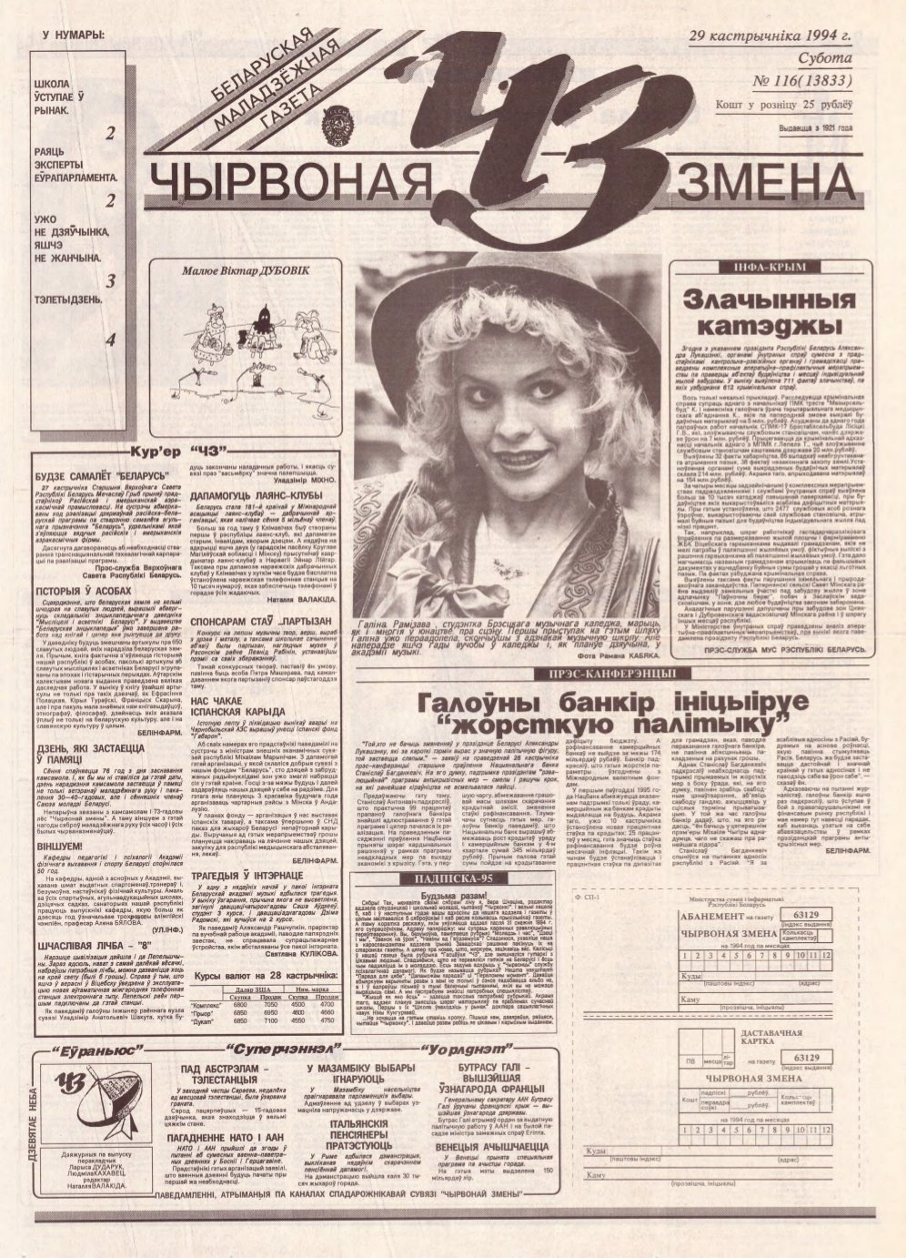 «Чырвоная змена» — беларуская маладзёжная газета. У 1921—2002 гадах з’яўлялася самастойным выданнем. З 2002 года дадатак да газеты «Звязда». З «Чырвонай зменай» ахвотна супрацоўнічаў Уладзімір Караткевіч, тут апублікаваны многія яго вершаваныя творы і эсэ: «Сплятайце рукі», «У тую ноч», «Як стажары ў небе заззялі», «Твой зорны шлях». На старонках газеты была апублікавана і аповесць Васіля Быкава «Жураўліны крык». Болей »