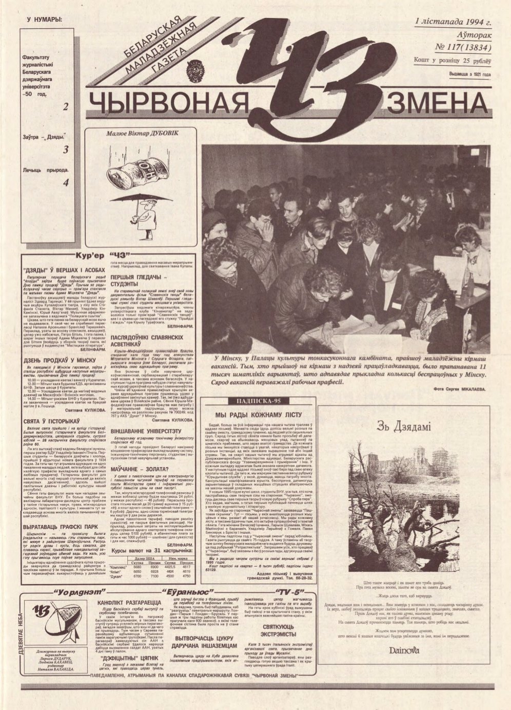 «Чырвоная змена» — беларуская маладзёжная газета. У 1921—2002 гадах з’яўлялася самастойным выданнем. З 2002 года дадатак да газеты «Звязда». З «Чырвонай зменай» ахвотна супрацоўнічаў Уладзімір Караткевіч, тут апублікаваны многія яго вершаваныя творы і эсэ: «Сплятайце рукі», «У тую ноч», «Як стажары ў небе заззялі», «Твой зорны шлях». На старонках газеты была апублікавана і аповесць Васіля Быкава «Жураўліны крык». Болей »