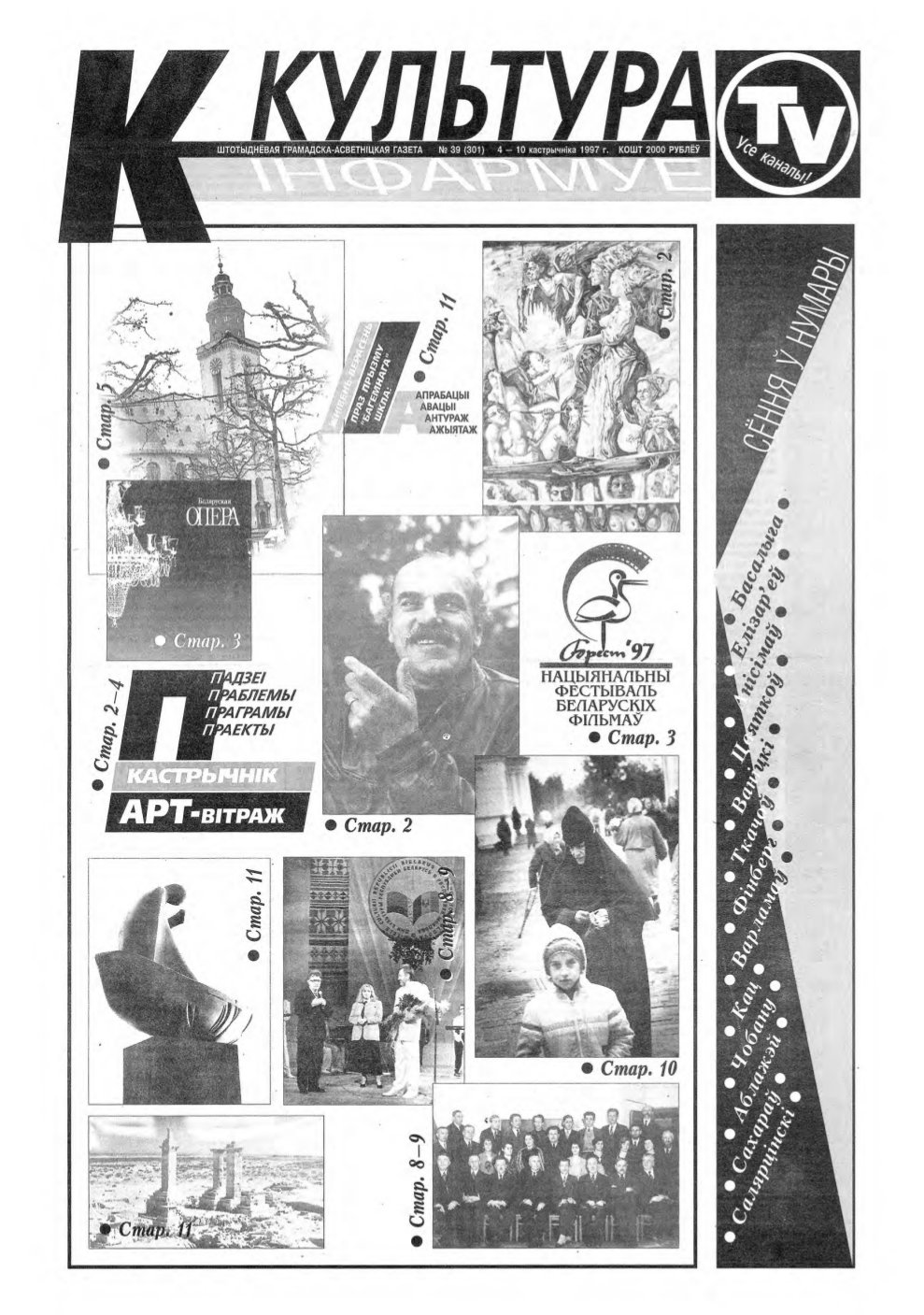 «Культура» — штотыднёвая грамадска-асветніцкая газета. Выдаецца з кастрычніка 1991 года ў Мінску на беларускай мове. Заснавальнік — Міністэрства культуры Рэспублікі Беларусь. З 2002 года з'яўляецца часткай рэдакцыйна-выдавецкай ўстановы «Культура і мастацтва», куды ўваходзіць разам з часопісам «Мастацтва». Болей »