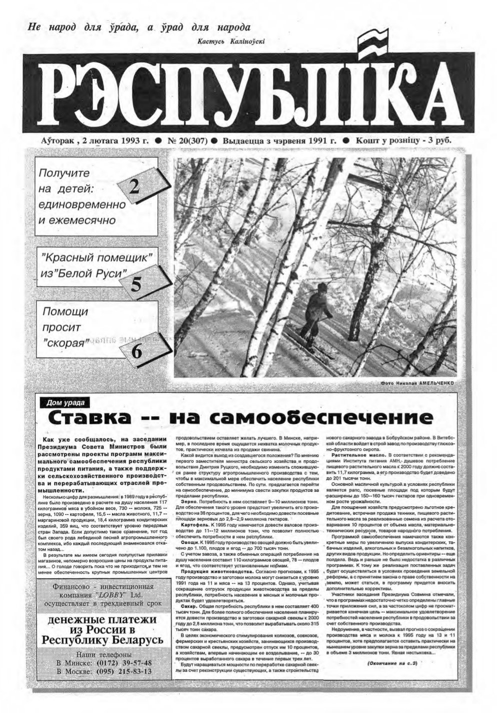 «Рэспубліка» — газета для тых, хто самастойна прымае рашэнні. Заснавальнік - Савет Міністраў Рэспублікі Беларусь. Выдаецца з чэрвеня 1991. Газета выходзіць 250 разоў у год. Аўтары апублікаваных матэрыялаў нясуць адказнасць за падбор і дакладнасць фактаў, іх меркаванні неабавязкова адлюстроўваюць пункт гледжання рэдакцыі. Рукапісы, фотаздымкі і малюнкі не рэцэнзуюцца I не вяртаюцца. Болей »