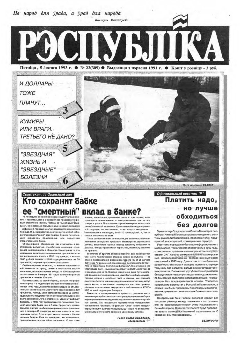 «Рэспубліка» — газета для тых, хто самастойна прымае рашэнні. Заснавальнік - Савет Міністраў Рэспублікі Беларусь. Выдаецца з чэрвеня 1991. Газета выходзіць 250 разоў у год. Аўтары апублікаваных матэрыялаў нясуць адказнасць за падбор і дакладнасць фактаў, іх меркаванні неабавязкова адлюстроўваюць пункт гледжання рэдакцыі. Рукапісы, фотаздымкі і малюнкі не рэцэнзуюцца і не вяртаюцца. Болей »