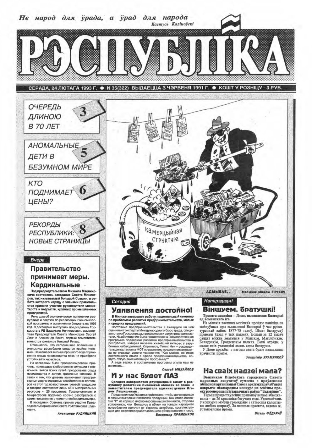 «Рэспубліка» — газета для тых, хто самастойна прымае рашэнні. Заснавальнік - Савет Міністраў Рэспублікі Беларусь. Выдаецца з чэрвеня 1991. Газета выходзіць 250 разоў у год. Аўтары апублікаваных матэрыялаў нясуць адказнасць за падбор і дакладнасць фактаў, іх меркаванні неабавязкова адлюстроўваюць пункт гледжання рэдакцыі. Рукапісы, фотаздымкі і малюнкі не рэцэнзуюцца I не вяртаюцца. More »