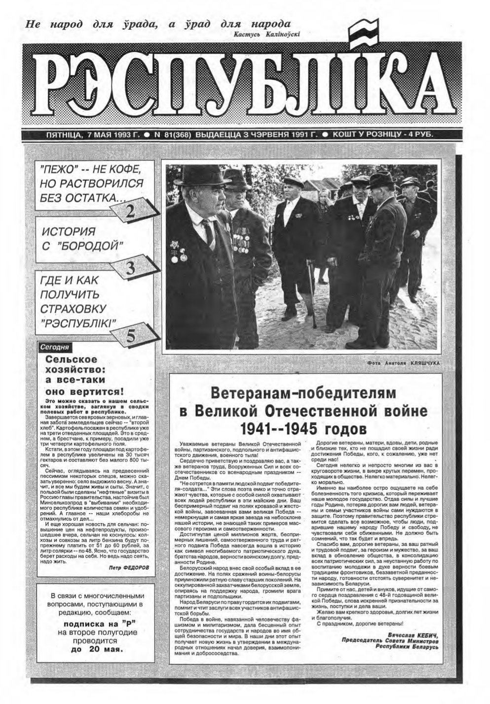 «Рэспубліка» — газета для тых, хто самастойна прымае рашэнні. Заснавальнік - Савет Міністраў Рэспублікі Беларусь. Выдаецца з чэрвеня 1991. Газета выходзіць 250 разоў у год. Аўтары апублікаваных матэрыялаў нясуць адказнасць за падбор і дакладнасць фактаў, іх меркаванні неабавязкова адлюстроўваюць пункт гледжання рэдакцыі. Рукапісы, фотаздымкі і малюнкі не рэцэнзуюцца і не вяртаюцца. More »