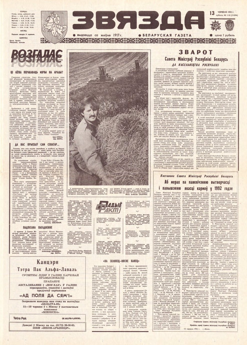 «Звязда» — орган Цэнтральнага Камітэта Камуністычнай партыі Беларусі, Вярхоўнага Савета і Савета Міністраў Беларускай ССР. Выходзіць 250 разоў на год. Аўтары апублікаваных матэрыялаў нясуць адказнасць за падбор і дакладнасць фактаў. Іх меркаванні неабавязкова адлюстроўваюць пункт гледжання рэдакцыі. Болей »