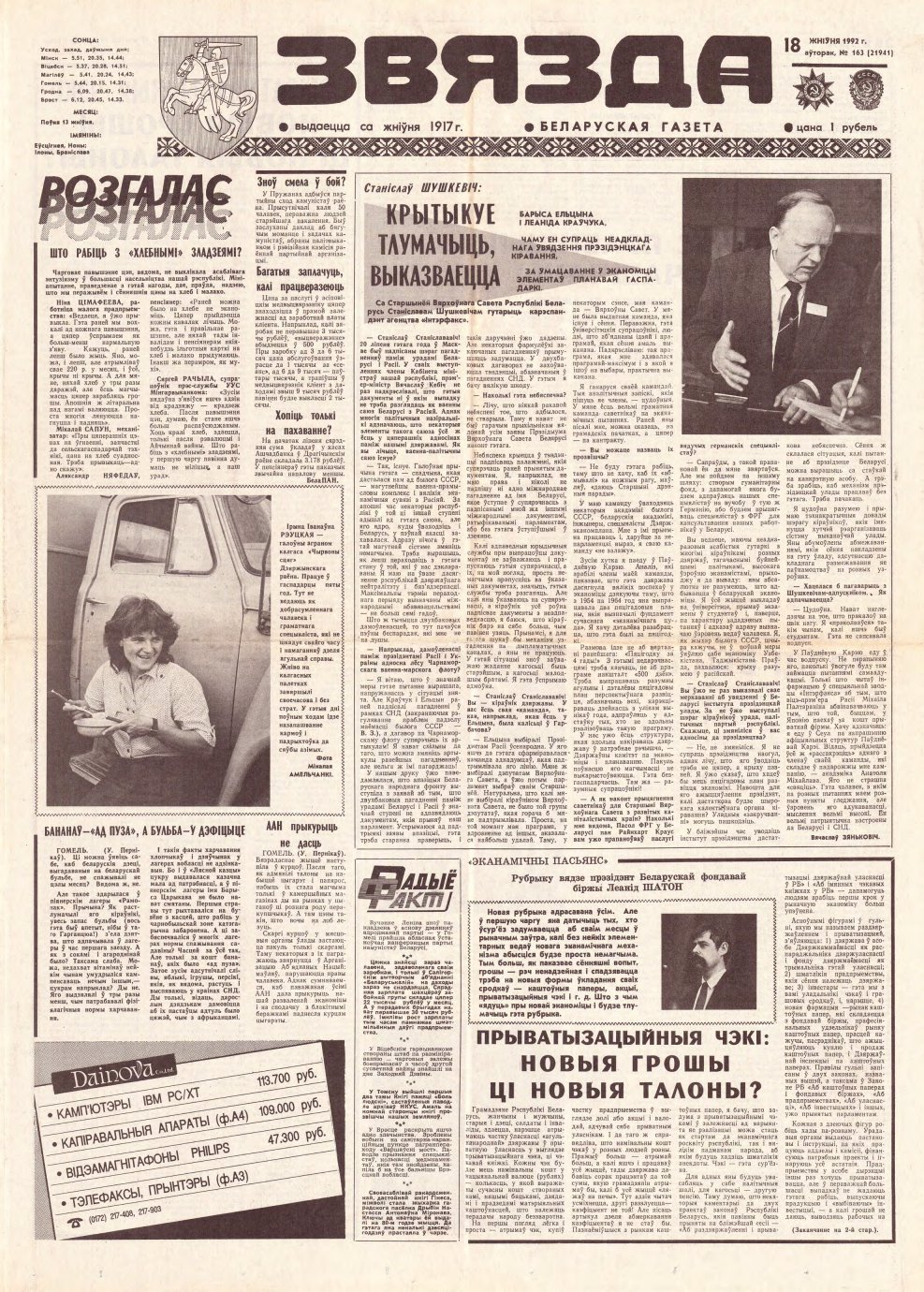 «Звязда» — орган Цэнтральнага Камітэта Камуністычнай партыі Беларусі, Вярхоўнага Савета і Савета Міністраў Беларускай ССР. Выходзіць 250 разоў на год. Аўтары апублікаваных матэрыялаў нясуць адказнасць за падбор і дакладнасць фактаў. Іх меркаванні неабавязкова адлюстроўваюць пункт гледжання рэдакцыі. Болей »
