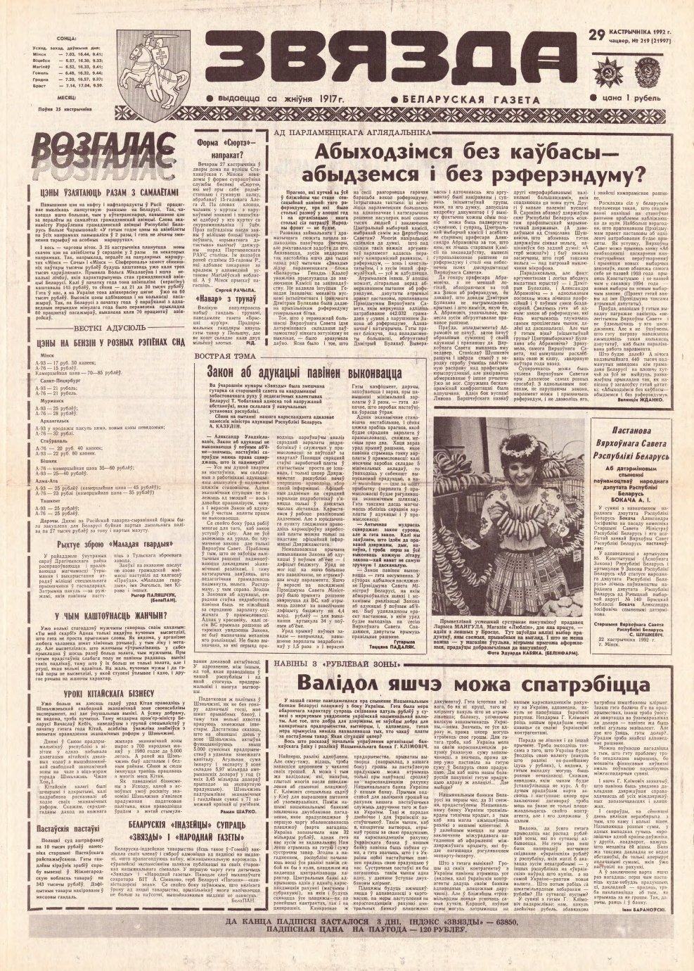 «Звязда» — орган Цэнтральнага Камітэта Камуністычнай партыі Беларусі, Вярхоўнага Савета і Савета Міністраў Беларускай ССР. Выходзіць 250 разоў на год. Аўтары апублікаваных матэрыялаў нясуць адказнасць за падбор і дакладнасць фактаў. Іх меркаванні неабавязкова адлюстроўваюць пункт гледжання рэдакцыі. Болей »