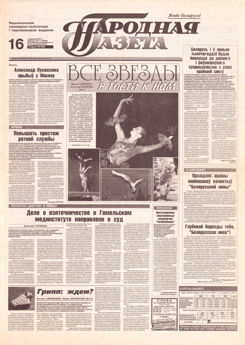 «Народная газета» — орган Вярхоўнага Савета Рэспублікі Беларусь. Выдавец: Адкрытае акцыянернае таварыства Народная газета. Выходзіць штодзённа, акрамя нядзелі і панядзелка, 250 разоў у год. Выдаецца з кастрычніка 1990 года на беларускай і рускай мовах. З 1990 па 1995 год пасаду галоўнага рэдактара «Народнай газеты» займаў Іосіф Сярэдзіч. З мая 1990 па студзень 1996 — дэпутат Вярхоўнага Савета XII склікання. Выданне займала ўмераную цэнт... Болей »
