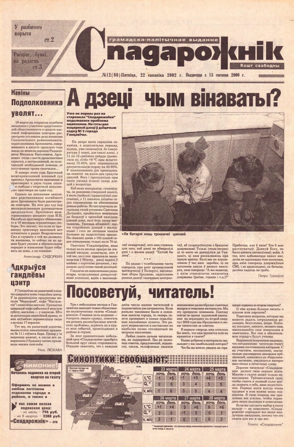 «Спадарожнікс» — грамадска-палітычнае выданне. Рукапісы і здымкі не рэцэнзуюцца і не вяртаюцца. Адказнасць за дакладнасць друкуемых фактаў і падзей нясуць аўтары. Выказаныя ў дасланых матэрыялах думкі могуць не супадаць з пунктам гледжання рэдакцыі газеты і не накладаюць на яе ніякіх абавязкаў. Адказнасць за змест рэкламы нясуць рэкламадаўцы. Болей »