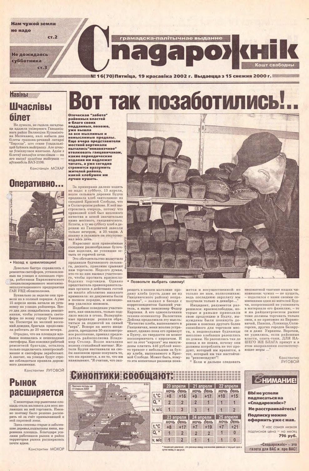 «Спадарожнікс» — грамадска-палітычнае выданне. Рукапісы і здымкі не рэцэнзуюцца і не вяртаюцца. Адказнасць за дакладнасць друкуемых фактаў і падзей нясуць аўтары. Выказаныя ў дасланых матэрыялах думкі могуць не супадаць з пунктам гледжання рэдакцыі газеты і не накладаюць на яе ніякіх абавязкаў. Адказнасць за змест рэкламы нясуць рэкламадаўцы. Болей »