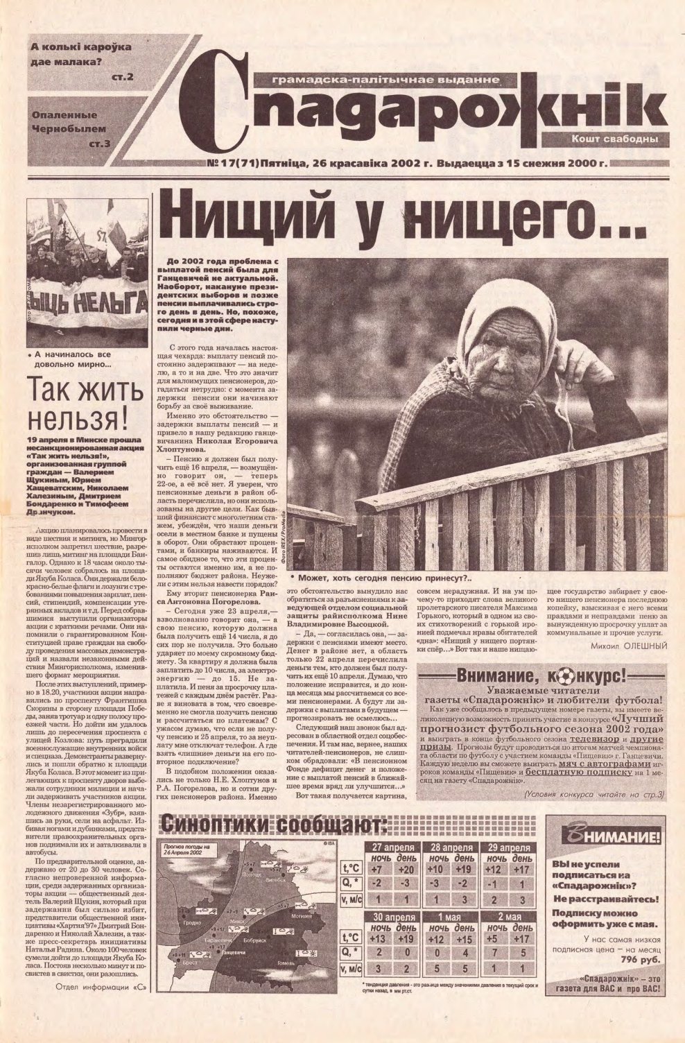 «Спадарожнікс» — грамадска-палітычнае выданне. Рукапісы і здымкі не рэцэнзуюцца і не вяртаюцца. Адказнасць за дакладнасць друкуемых фактаў і падзей нясуць аўтары. Выказаныя ў дасланых матэрыялах думкі могуць не супадаць з пунктам гледжання рэдакцыі газеты і не накладаюць на яе ніякіх абавязкаў. Адказнасць за змест рэкламы нясуць рэкламадаўцы. Болей »