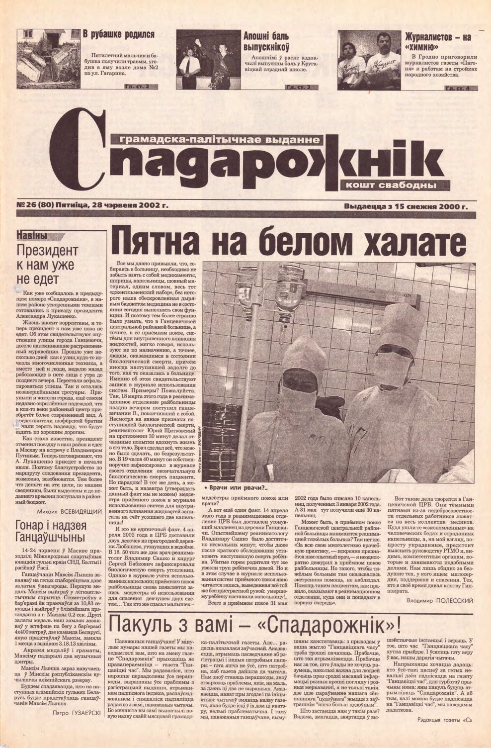 «Спадарожнікс» — грамадска-палітычнае выданне. Рукапісы і здымкі не рэцэнзуюцца і не вяртаюцца. Адказнасць за дакладнасць друкуемых фактаў і падзей нясуць аўтары. Выказаныя ў дасланых матэрыялах думкі могуць не супадаць з пунктам гледжання рэдакцыі газеты і не накладаюць на яе ніякіх абавязкаў. Адказнасць за змест рэкламы нясуць рэкламадаўцы. Болей »