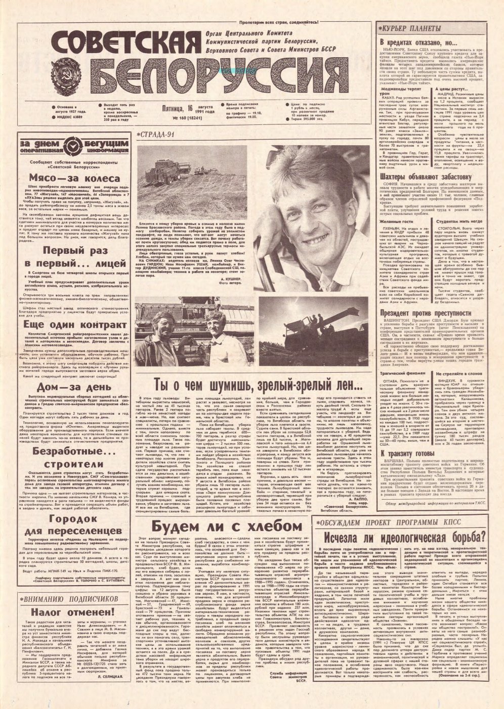 «Советская Белоруссия» — орган Центрального Комитета Коммунистической партии Белоруссии, Верховного Совета и Совета Министров БССР. Белорусская общественно-политическая газета. Издаётся с августа 1927 года. Выходит 5 раз в неделю. Учредители — Администрация президента Республики Беларусь и редакционный совет. На апрель 2019 года тираж — 190 тыс. экземпляров. Крупнейшее печатное СМИ страны. При этом во многих СМИ неоднократно сообщалось ... Болей »