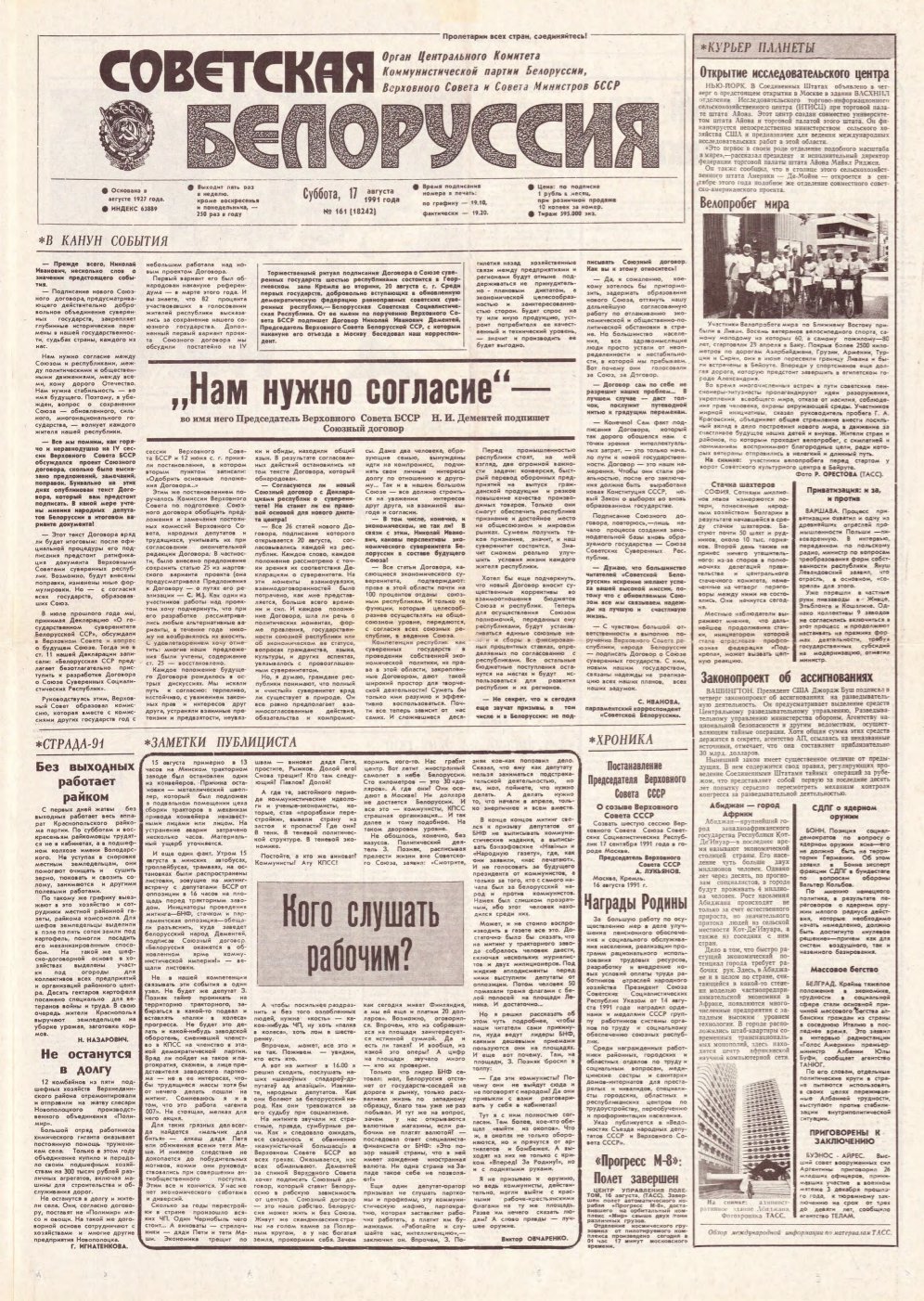 «Советская Белоруссия» — орган Центрального Комитета Коммунистической партии Белоруссии, Верховного Совета и Совета Министров БССР. Белорусская общественно-политическая газета. Издаётся с августа 1927 года. Выходит 5 раз в неделю. Учредители — Администрация президента Республики Беларусь и редакционный совет. На апрель 2019 года тираж — 190 тыс. экземпляров. Крупнейшее печатное СМИ страны. При этом во многих СМИ неоднократно сообщалось ... Болей »