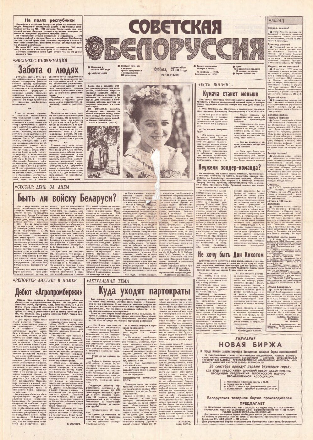 «Советская Белоруссия» — орган Центрального Комитета Коммунистической партии Белоруссии, Верховного Совета и Совета Министров БССР. Белорусская общественно-политическая газета. Издаётся с августа 1927 года. Выходит 5 раз в неделю. Учредители — Администрация президента Республики Беларусь и редакционный совет. На апрель 2019 года тираж — 190 тыс. экземпляров. Крупнейшее печатное СМИ страны. При этом во многих СМИ неоднократно сообщалось ... Болей »