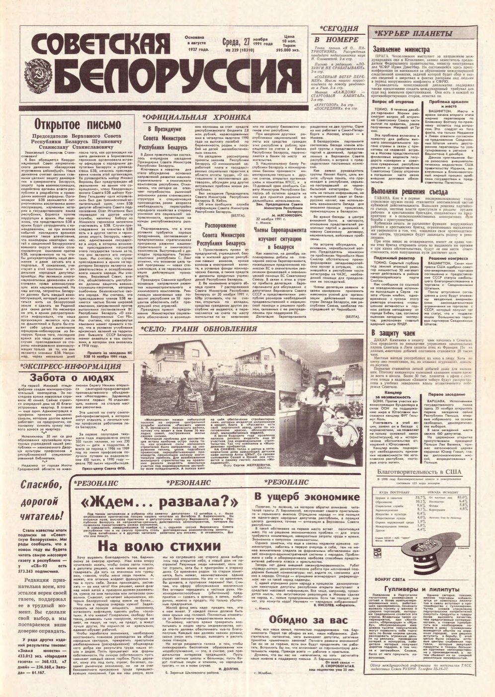 «Советская Белоруссия» — орган Центрального Комитета Коммунистической партии Белоруссии, Верховного Совета и Совета Министров БССР. Белорусская общественно-политическая газета. Издаётся с августа 1927 года. Выходит 5 раз в неделю. Учредители — Администрация президента Республики Беларусь и редакционный совет. На апрель 2019 года тираж — 190 тыс. экземпляров. Крупнейшее печатное СМИ страны. При этом во многих СМИ неоднократно сообщалось ... Болей »