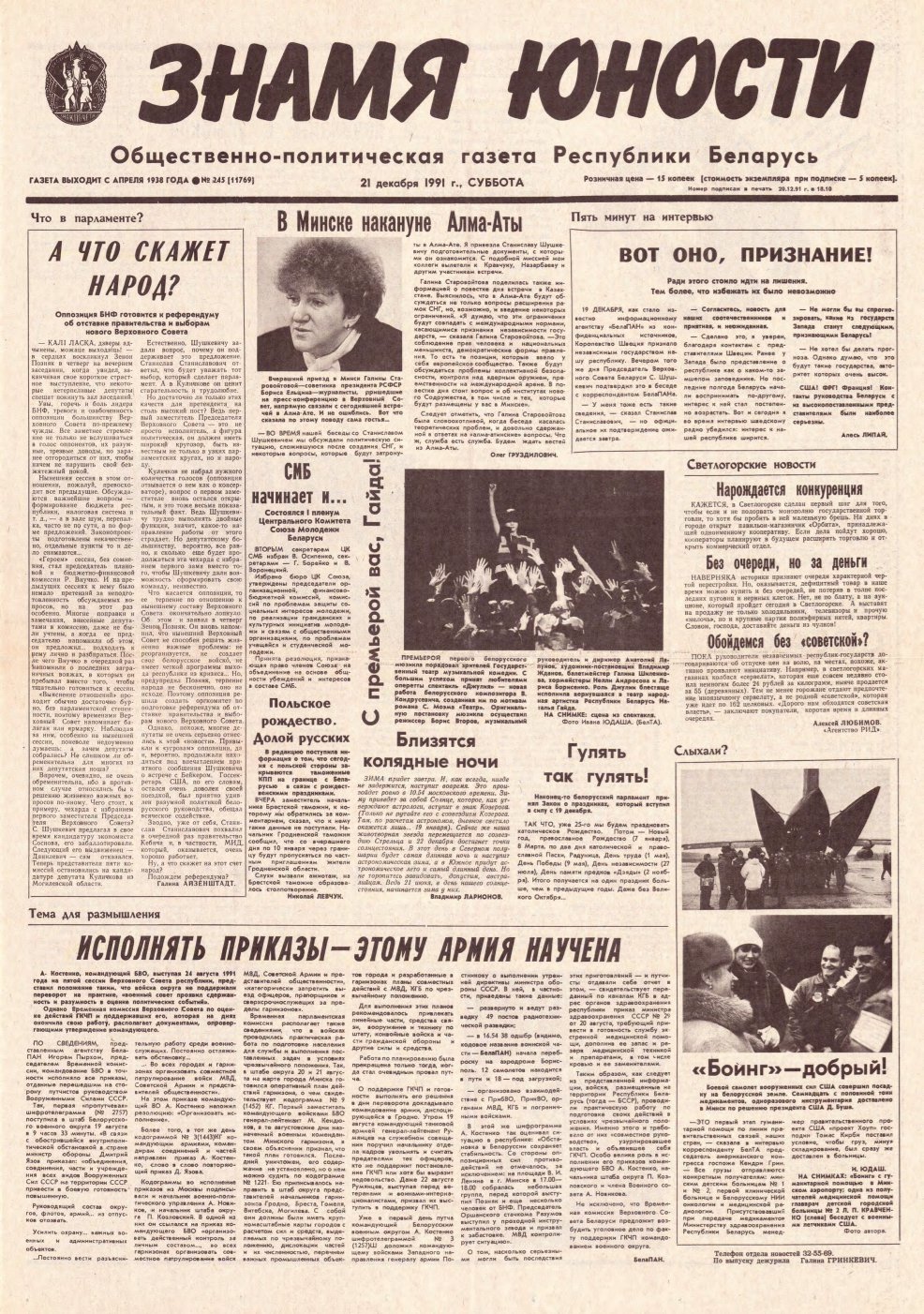 «Знамя юности» — общественно-политическая газета Белоруссии. Газета образована в 1938 году как совместный печатный орган Центрального комитета и Минского областного комитета ЛКСМ Белоруссии. Первый номер вышел 10 апреля 1938 года. Называлась газета «Сталинская молодёжь». Учредителем газеты с 1956 года являлся ЦК ЛКСМ Белоруссии. В годы Великой Отечественной войны газета выходила на одном из фронтов Красной Армии в виде листовки формата ... Болей »