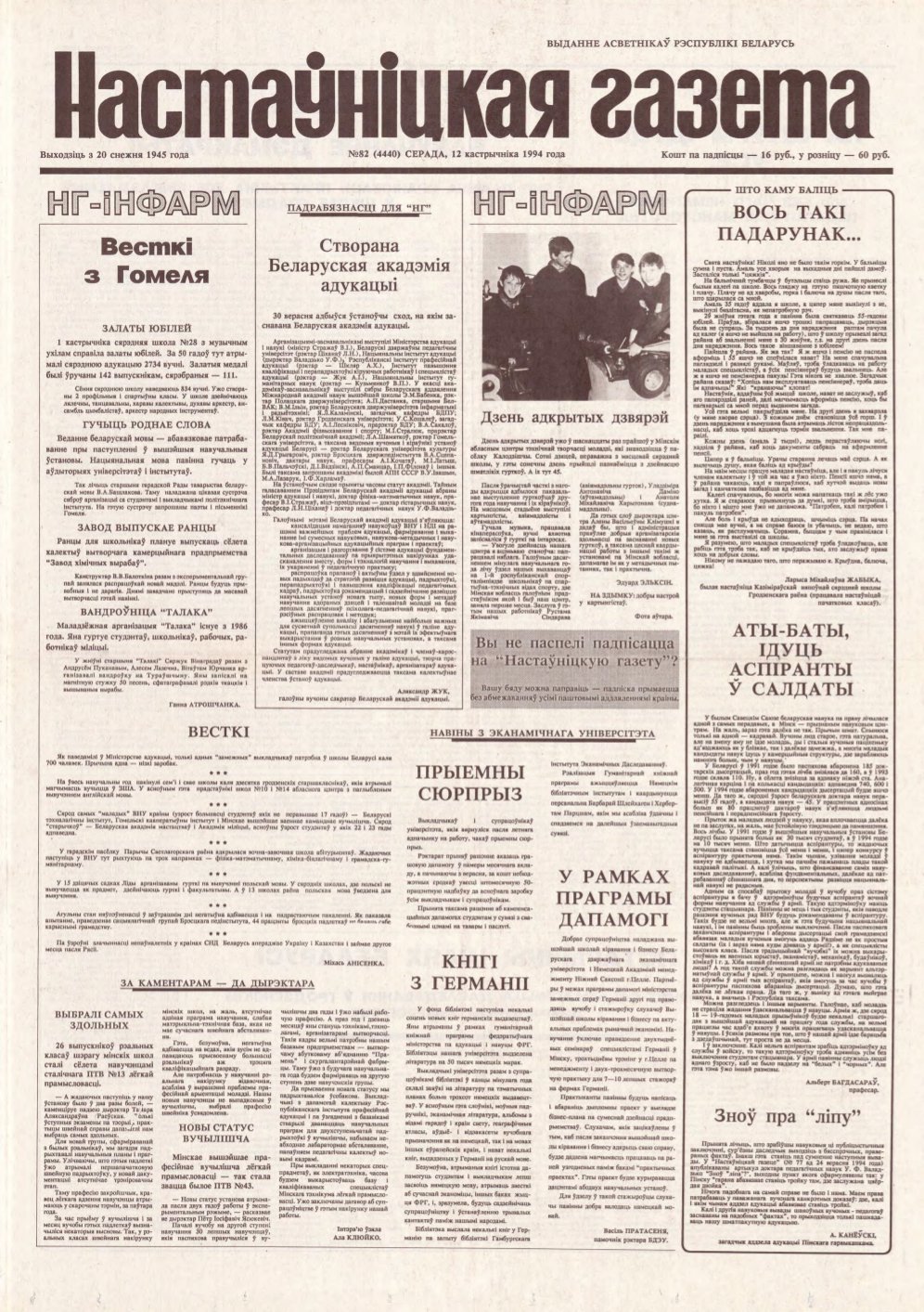«Настаўніцкая газета» — выданне асветнікаў Рэспублікі Беларусь. Заснавана Міністэрствам адукацыі Рэспублікі Беларусь, выдаецца рэдакцыйна-выдавецкай установай «Выдавецкі дом „Педагагічная прэса“». Выходзіць з 20 снежня 1945 года ў Мінску на беларускай мове (да 1957 года — 1 раз, з 1958 года — 2 разы, з 1998 года — 3 разы на тыдзень). У ліпені 2022 года газета стала выходзіць 2 разы на тыдзень, што значна зменшыла агульны аб’ём выдання. ... Болей »