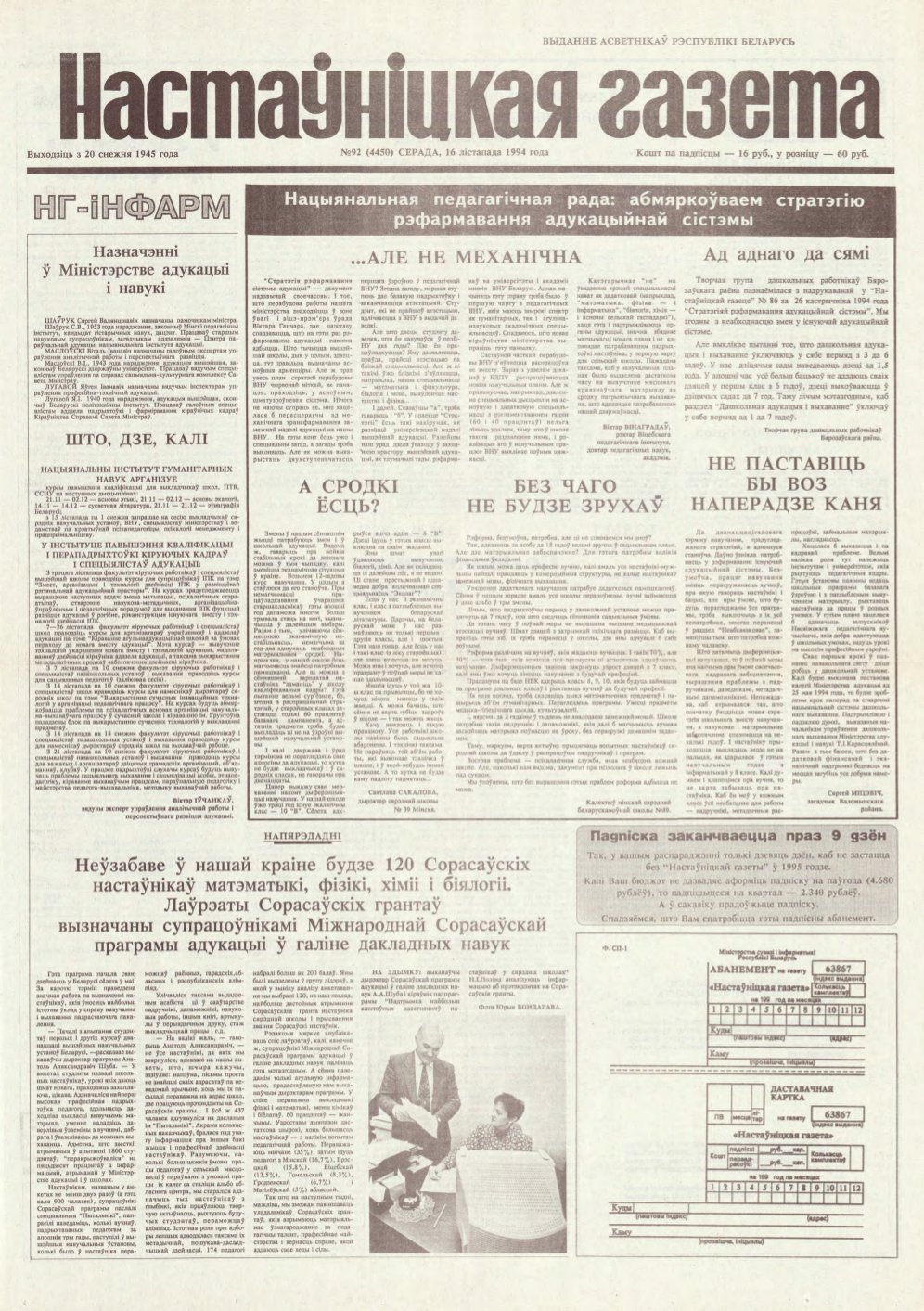 «Настаўніцкая газета» — выданне асветнікаў Рэспублікі Беларусь. Заснавана Міністэрствам адукацыі Рэспублікі Беларусь, выдаецца рэдакцыйна-выдавецкай установай «Выдавецкі дом „Педагагічная прэса“». Выходзіць з 20 снежня 1945 года ў Мінску на беларускай мове (да 1957 года — 1 раз, з 1958 года — 2 разы, з 1998 года — 3 разы на тыдзень). У ліпені 2022 года газета стала выходзіць 2 разы на тыдзень, што значна зменшыла агульны аб’ём выдання. ... Болей »