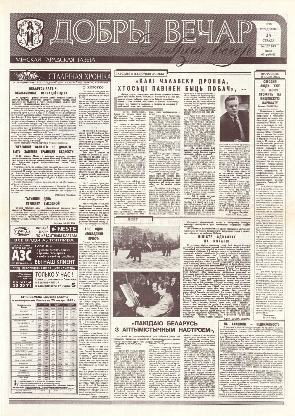 «Добры вечар» — мінская гарадская газета. Выдаеццап з лістапада 1990. Заснавальнік: Мінскі гарадскі Савет народных дэпутатаў. Аўтары змешчаных матэрыялаў нясуць адказнасць за падбор і дакладнасць прыведзеных фактаў, цытат, эканамічных даных, асабістых імён, геаграфічных назваў і іншай інфармацыі, а таксама за тое, каб у матэрыялах не ўтрымлівалася звестак, якія не падлягаюць адкрытай публікацыі. Допісы, атрыманыя рэдакцыяй, не рэцэнзуюц... Болей »