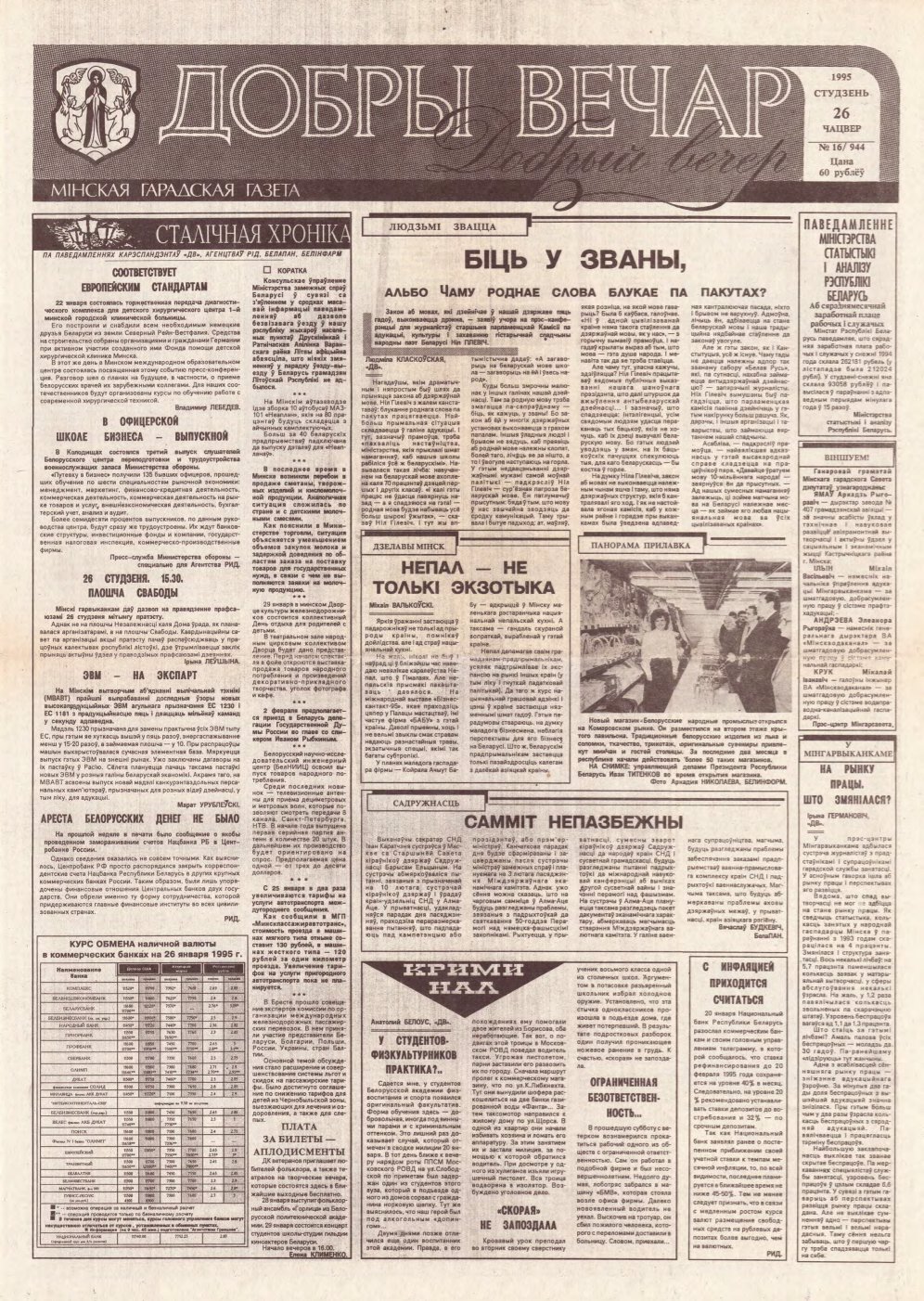 «Добры вечар» — мінская гарадская газета. Выдаеццап з лістапада 1990. Заснавальнік: Мінскі гарадскі Савет народных дэпутатаў. Аўтары змешчаных матэрыялаў нясуць адказнасць за падбор і дакладнасць прыведзеных фактаў, цытат, эканамічных даных, асабістых імён, геаграфічных назваў і іншай інфармацыі, а таксама за тое, каб у матэрыялах не ўтрымлівалася звестак, якія не падлягаюць адкрытай публікацыі. Допісы, атрыманыя рэдакцыяй, не рэцэнзуюц... Болей »
