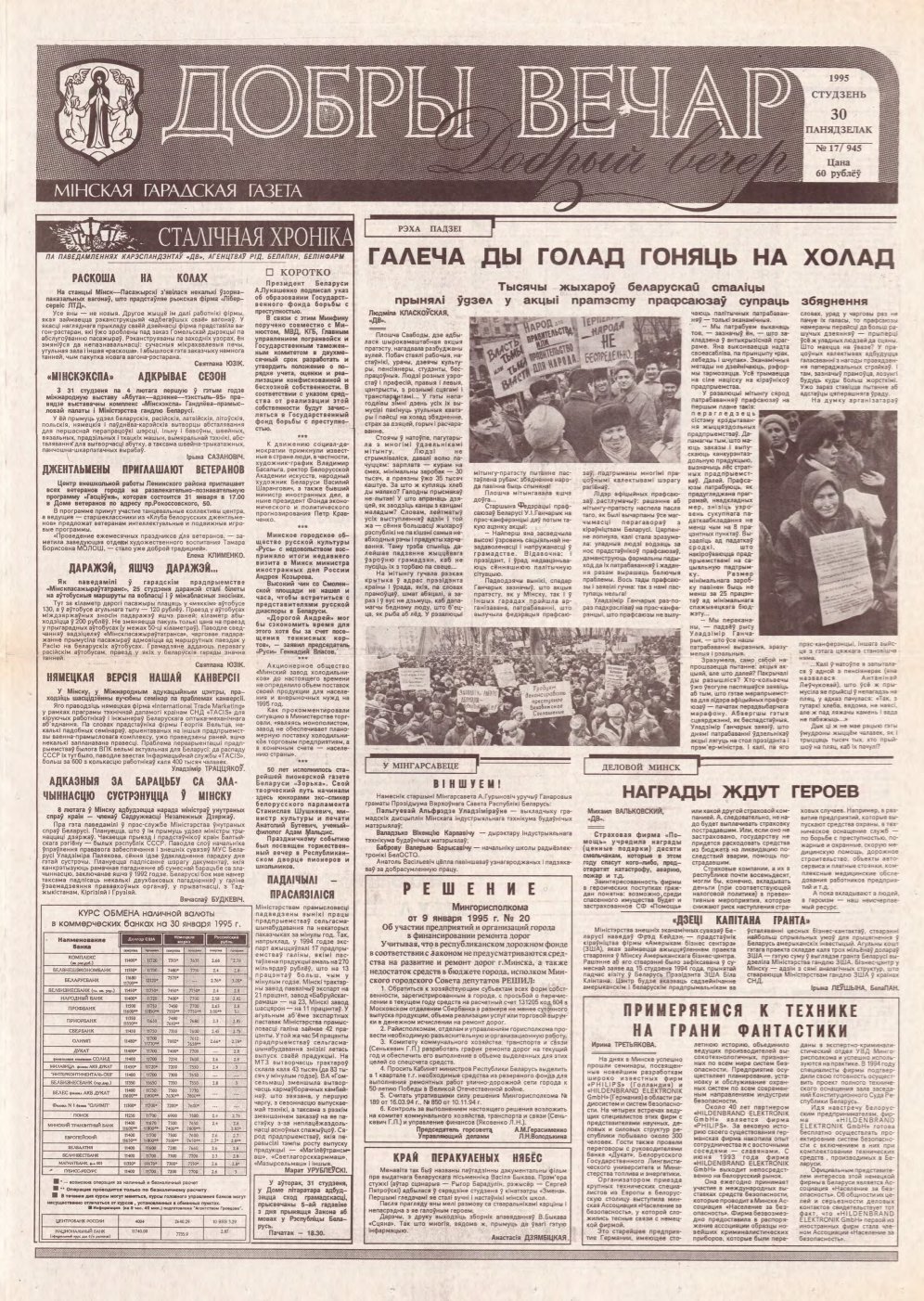 «Добры вечар» — мінская гарадская газета. Выдаеццап з лістапада 1990. Заснавальнік: Мінскі гарадскі Савет народных дэпутатаў. Аўтары змешчаных матэрыялаў нясуць адказнасць за падбор і дакладнасць прыведзеных фактаў, цытат, эканамічных даных, асабістых імён, геаграфічных назваў і іншай інфармацыі, а таксама за тое, каб у матэрыялах не ўтрымлівалася звестак, якія не падлягаюць адкрытай публікацыі. Допісы, атрыманыя рэдакцыяй, не рэцэнзуюц... Болей »