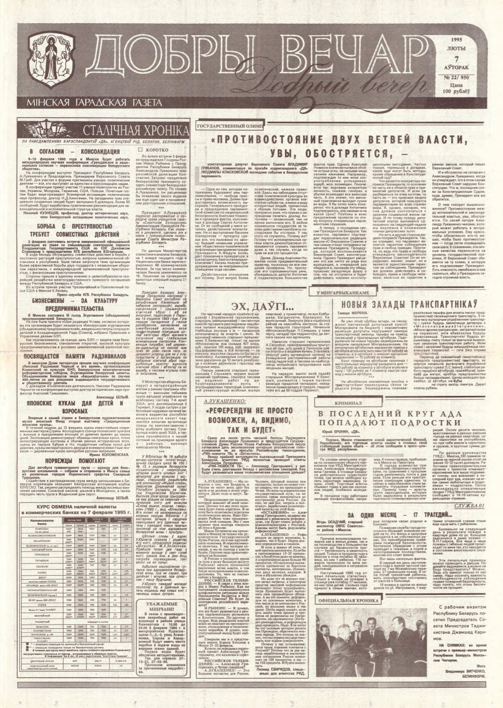 «Добры вечар» — мінская гарадская газета. Выдаеццап з лістапада 1990. Заснавальнік: Мінскі гарадскі Савет народных дэпутатаў. Аўтары змешчаных матэрыялаў нясуць адказнасць за падбор і дакладнасць прыведзеных фактаў, цытат, эканамічных даных, асабістых імён, геаграфічных назваў і іншай інфармацыі, а таксама за тое, каб у матэрыялах не ўтрымлівалася звестак, якія не падлягаюць адкрытай публікацыі. Допісы, атрыманыя рэдакцыяй, не рэцэнзуюц... Болей »