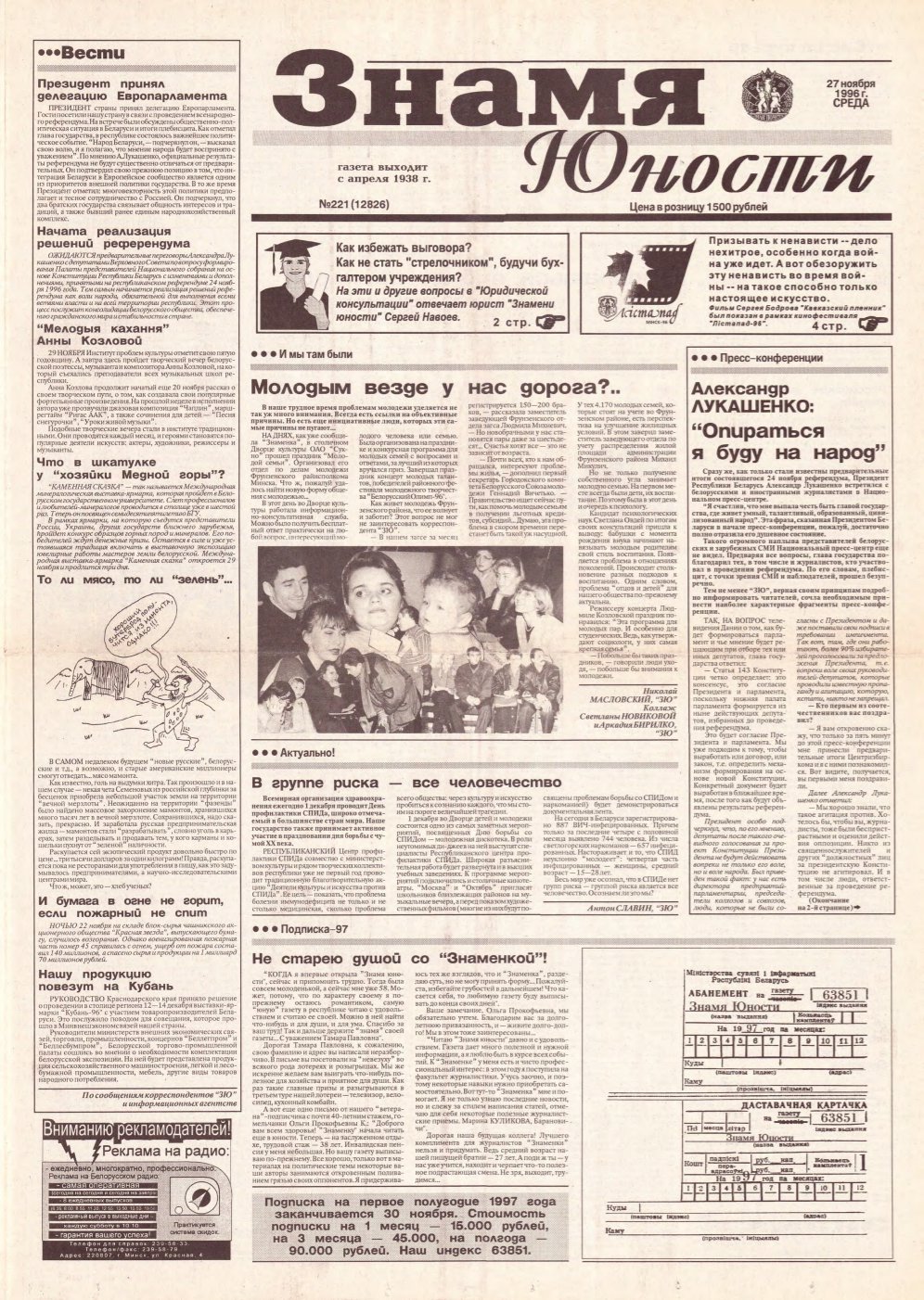 Выдавец: Кабинет Министров Республики Беларусь, трудовой коллектив редакции газеты Знамя юности
